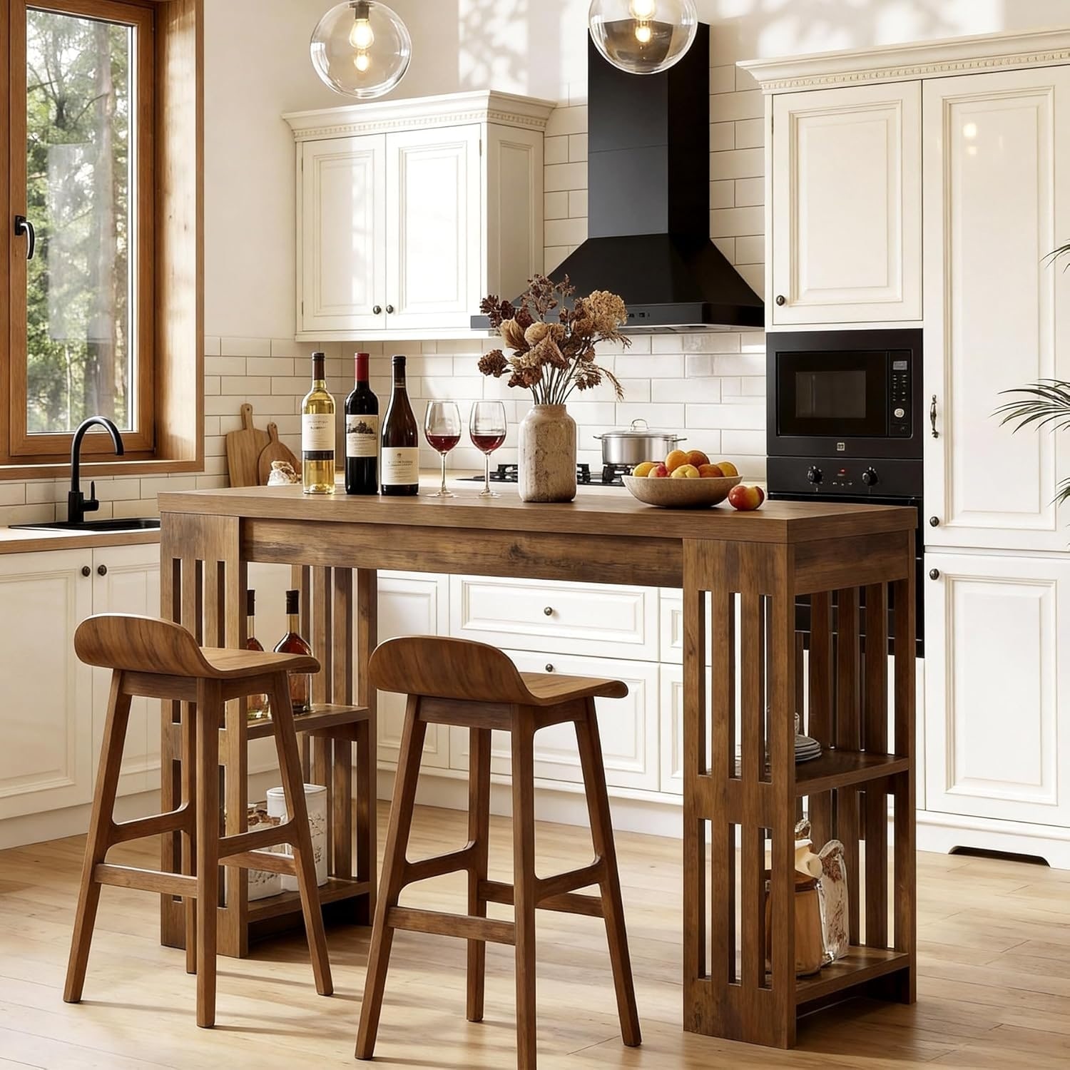 63 Inch Bar Table, Wooden Bistro Table with Wine Rack, Large Home Bar Unit, Pub Table with Storage Shelves
