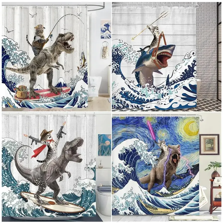 Creative Funny Cat Riding Dinosaur Shower Curtain Ocean Sea Waves Polyester Bathroom Decor With Hook 90x180cm 3