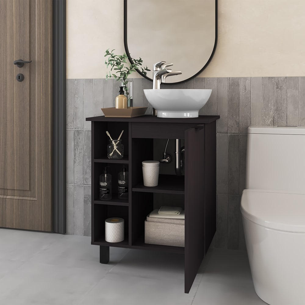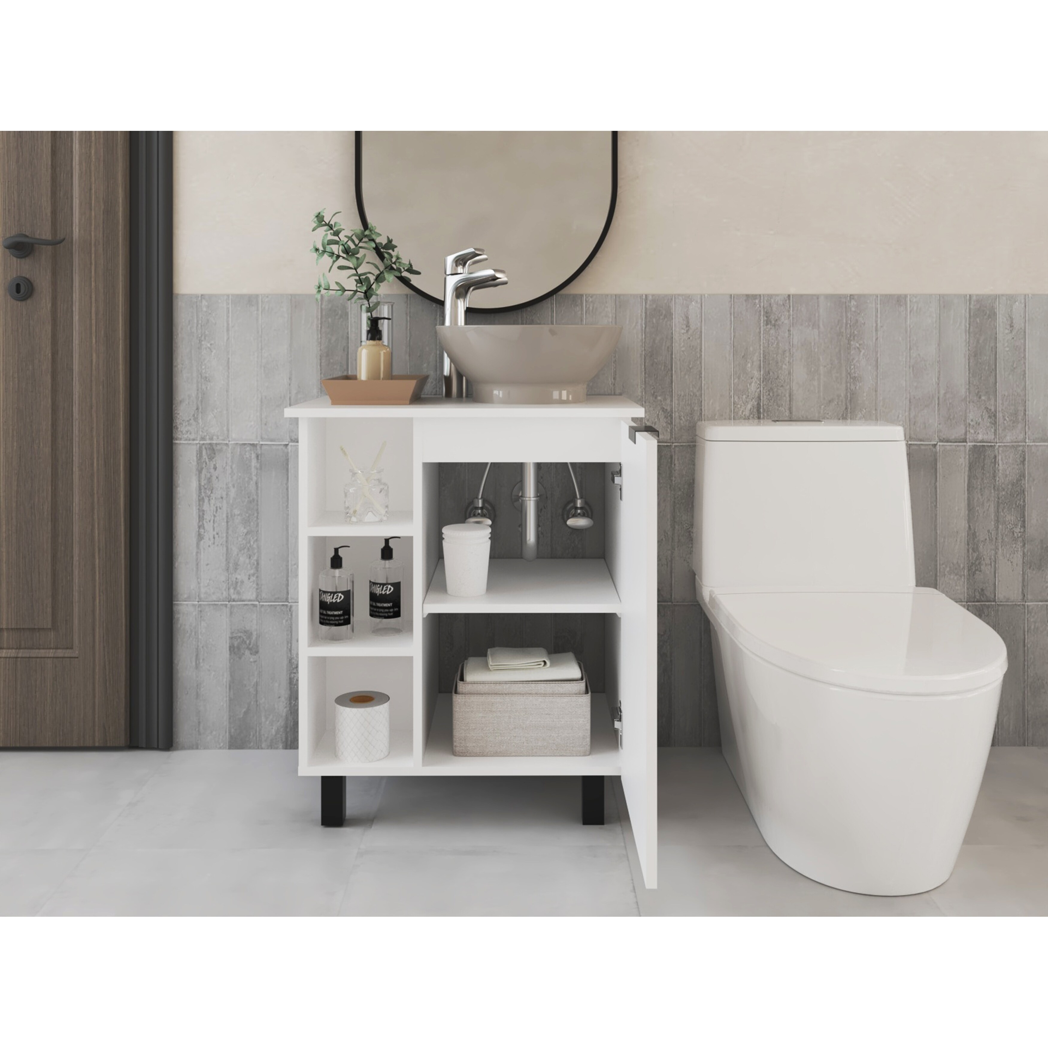 Bethel Wide One-Door Cabinet, Free Standing Vanity With Resin Sink And Two Shelves, Bathroom Storage, White