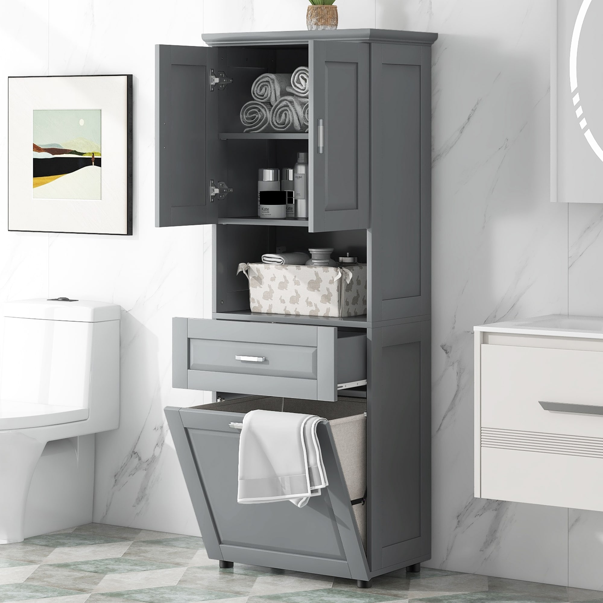 Tall Bathroom Cabinet with Laundry Basket, Large Storage Space Tilt-Out Laundry Hamper and Upper Storage Cabinet, White