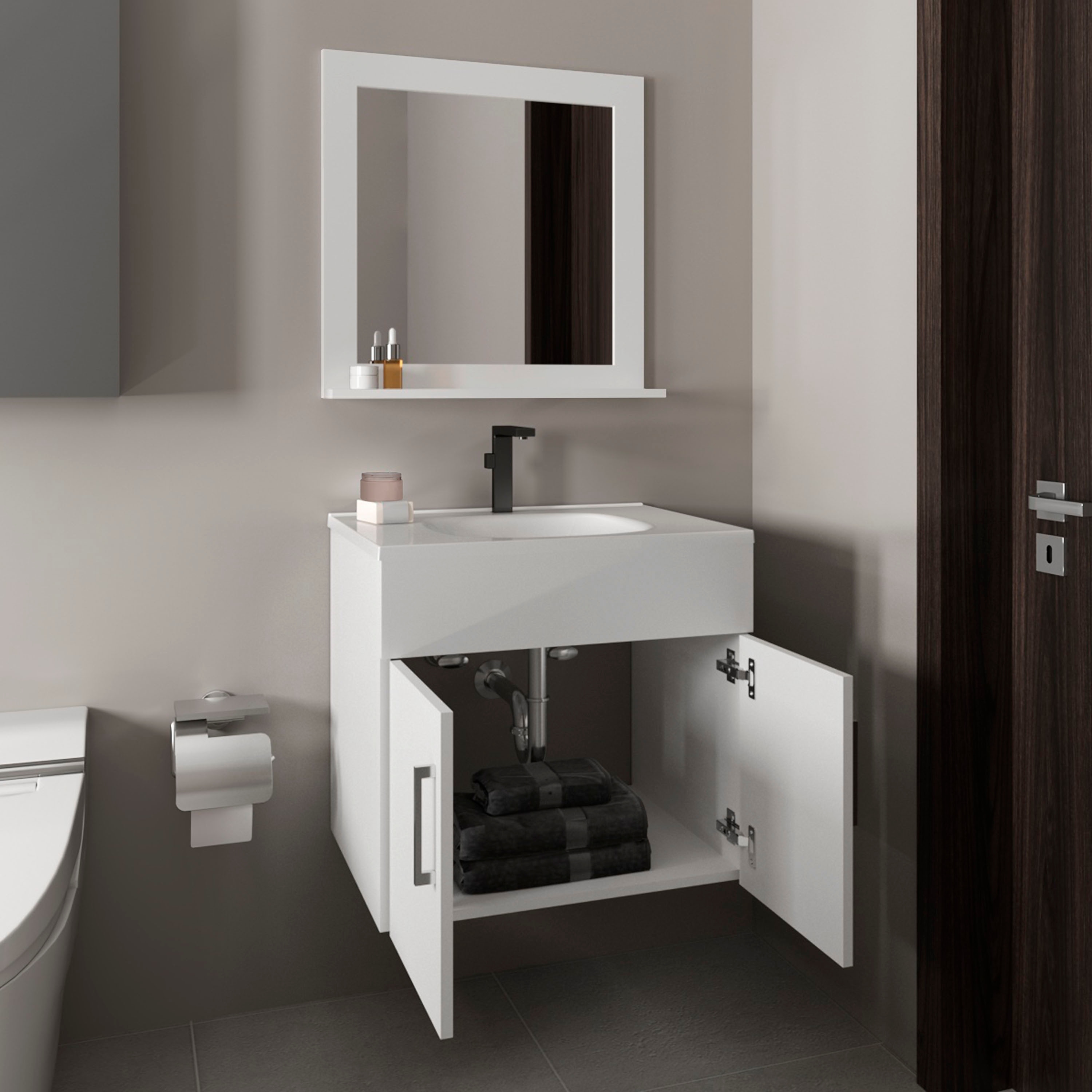 Bathroom Set, Vanity Sink + Mirror, 2 Doors, 1 Shelf, 1 Mirror, White