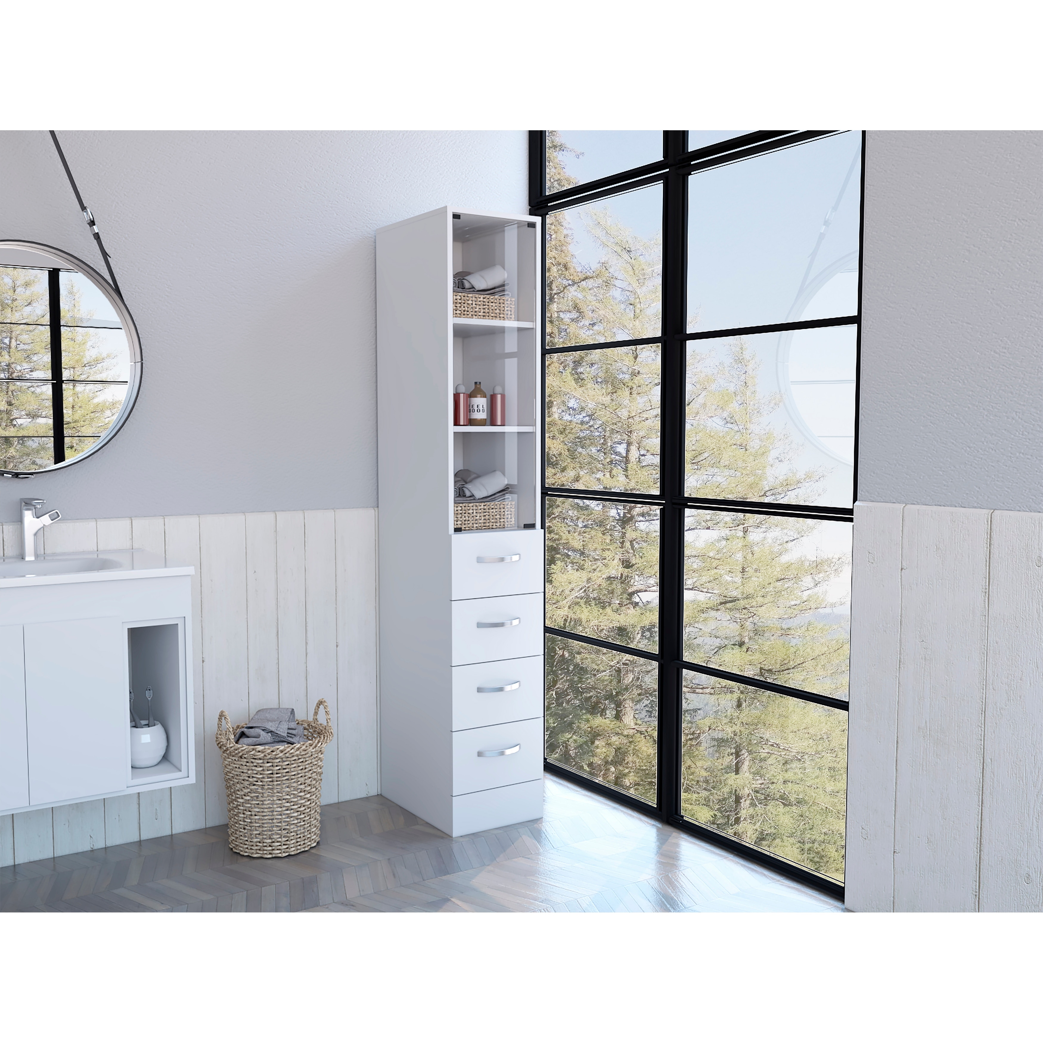 Linen Cabinet, Three Shelves, Four Drawers