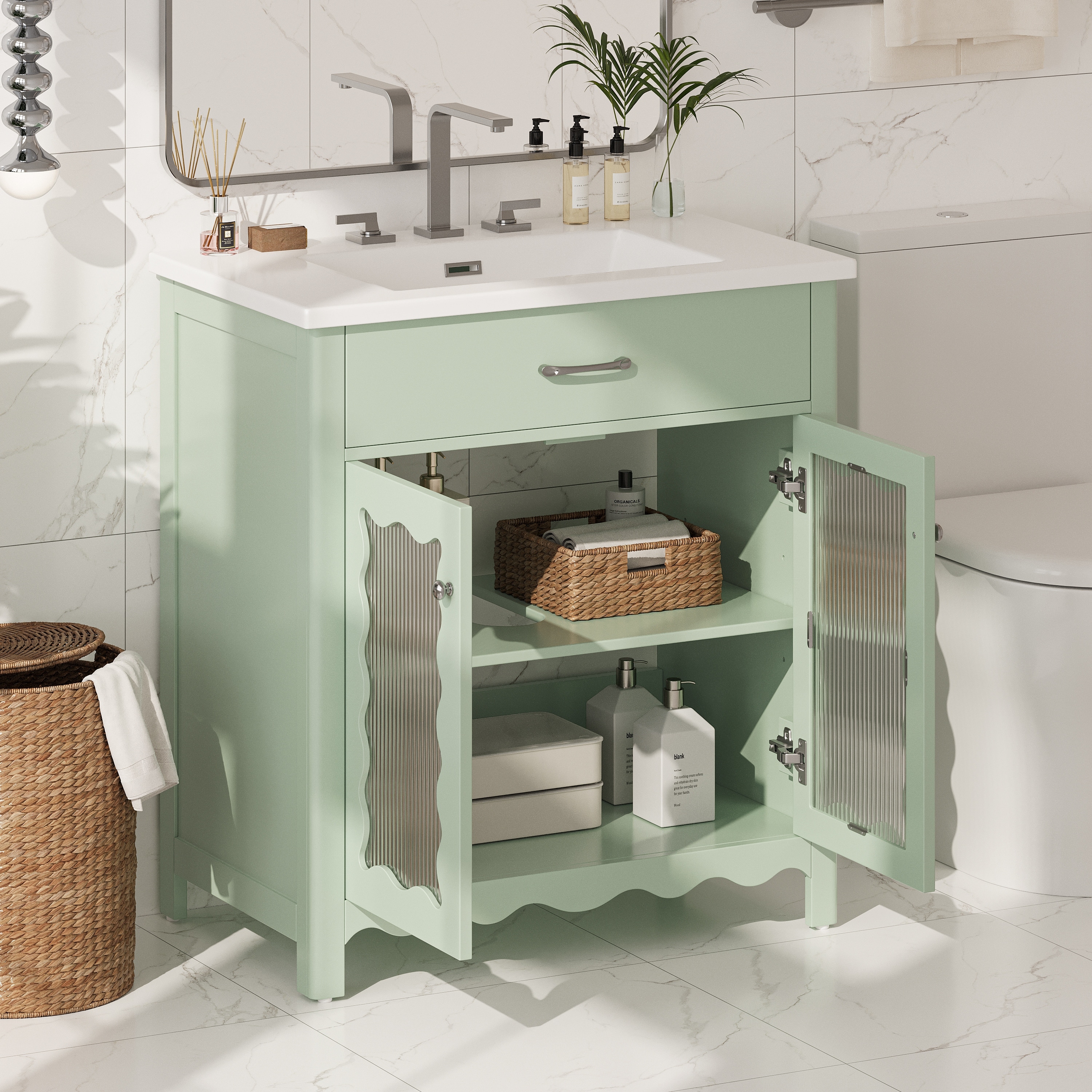 31" Bathroom Vanity with Tempered Glass, Modern Bathroom Cabinet with Rubber Wood legs and Soft close Doors, Green