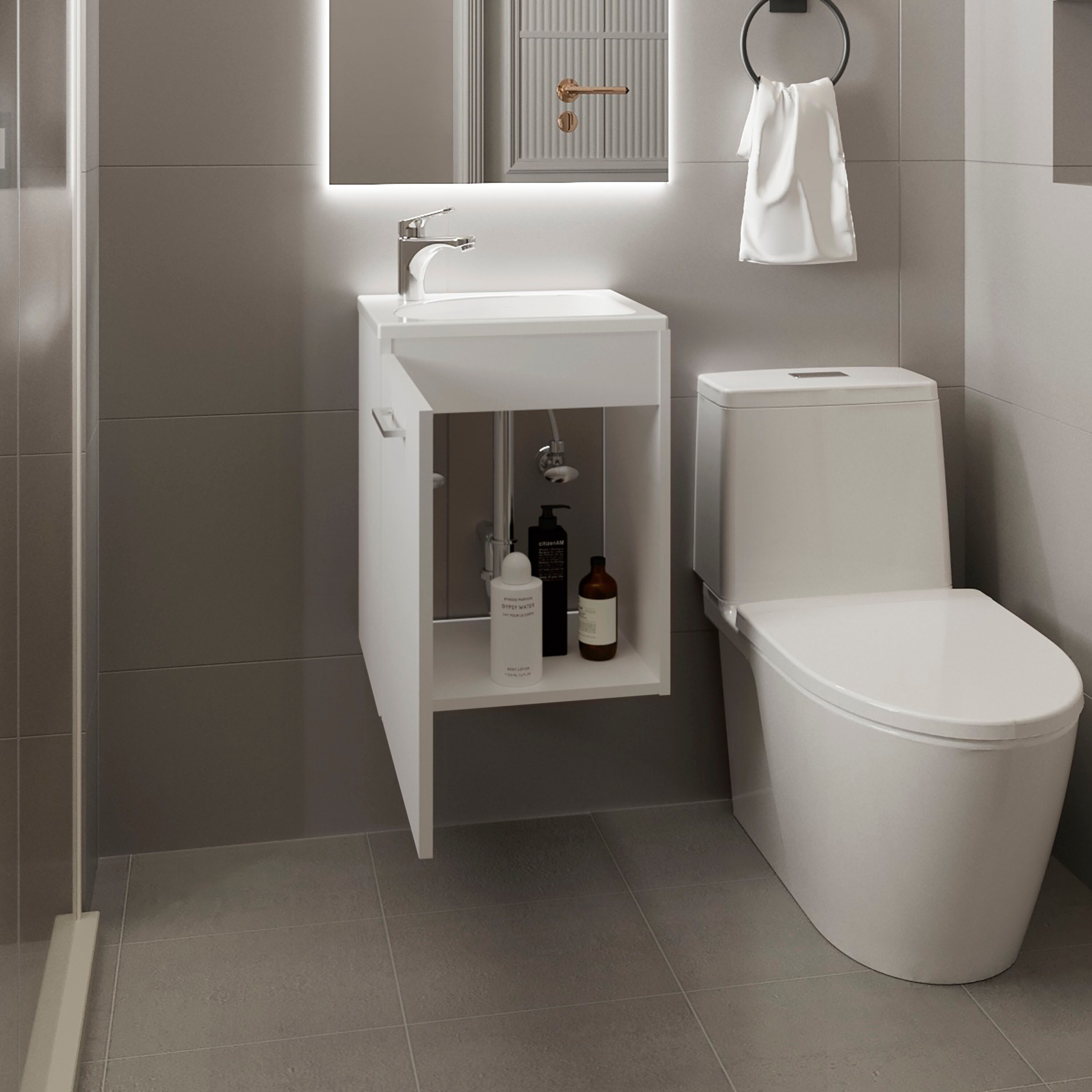 Saju Floating, Wide One-Door Cabinet Vanity, With Resin Sink And One Shelf, Bathroom Storage, White