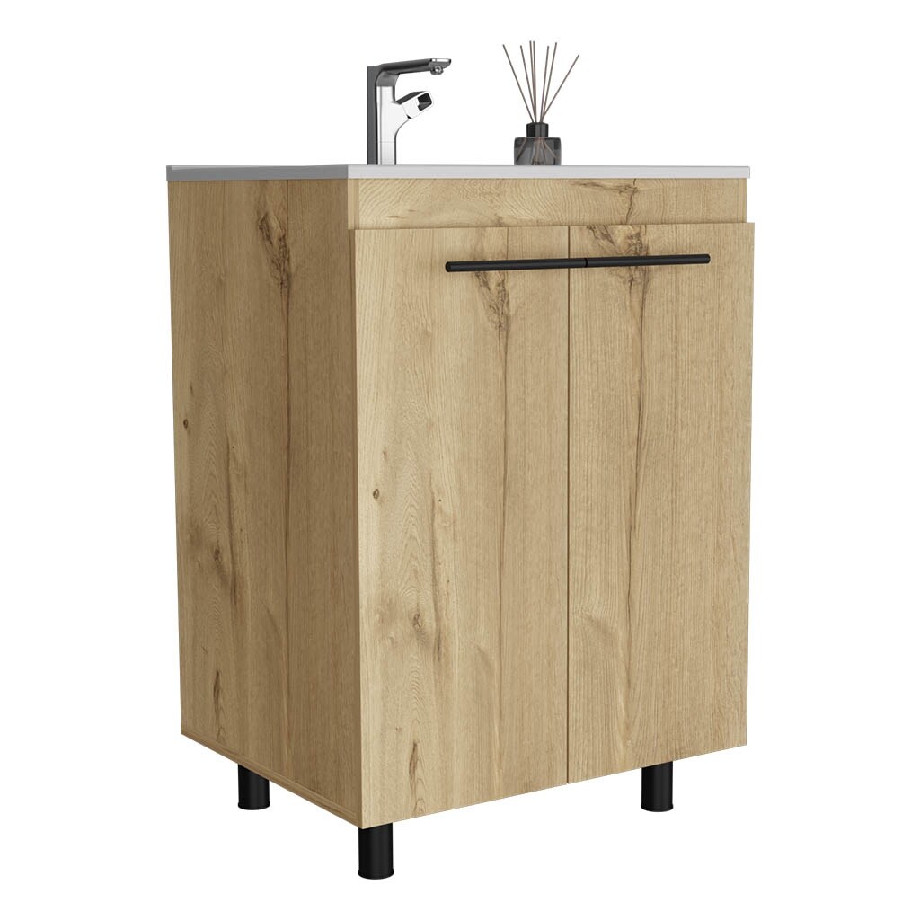 Free Standing Sink Cabinet, Four Legs, Double Door Cabinet, Two Shelves, Light Oak
