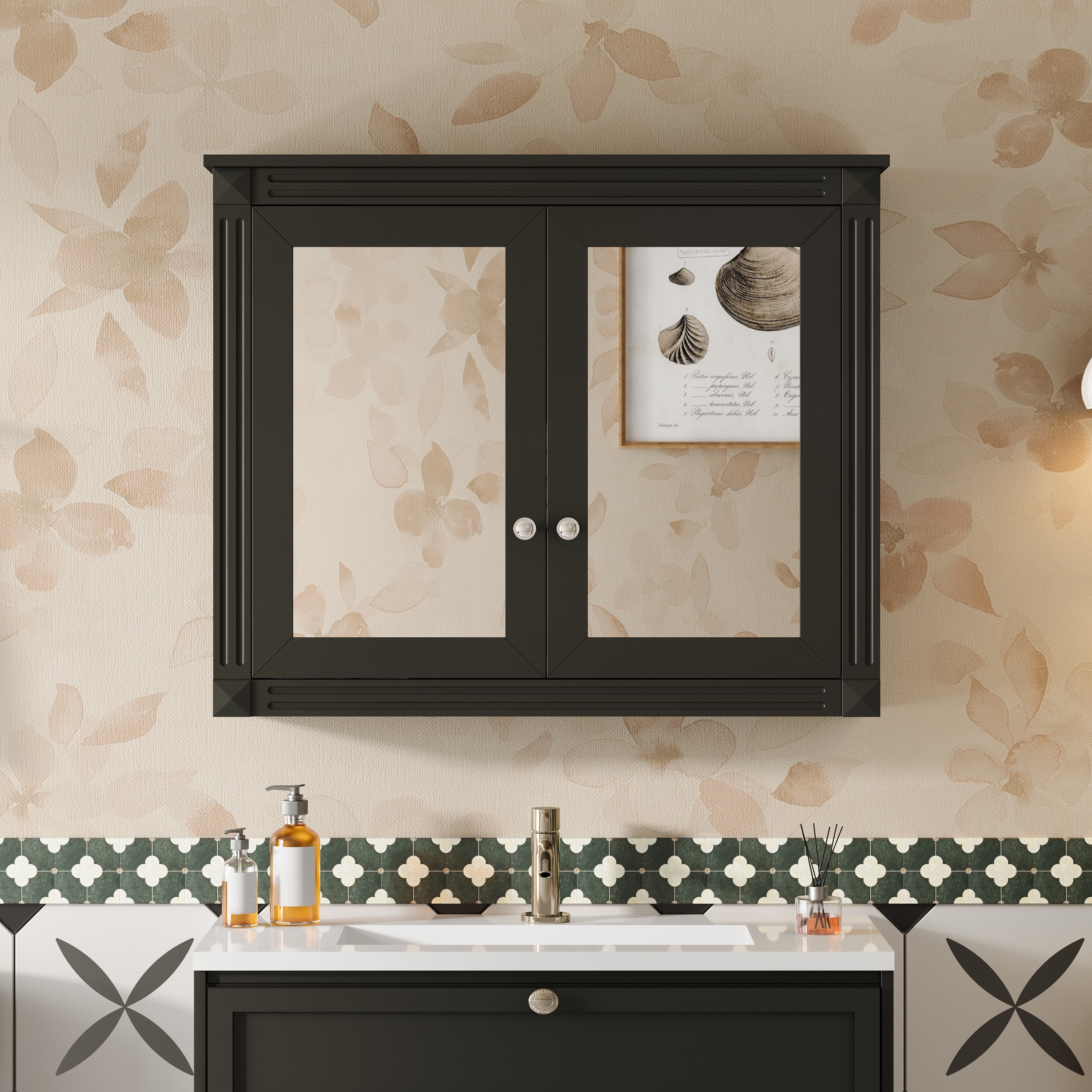 Roomfitters 24.8" Vintage Glass Door Wall Cabinet with Double Doors, Three-Tier Storage, and Towel Rack