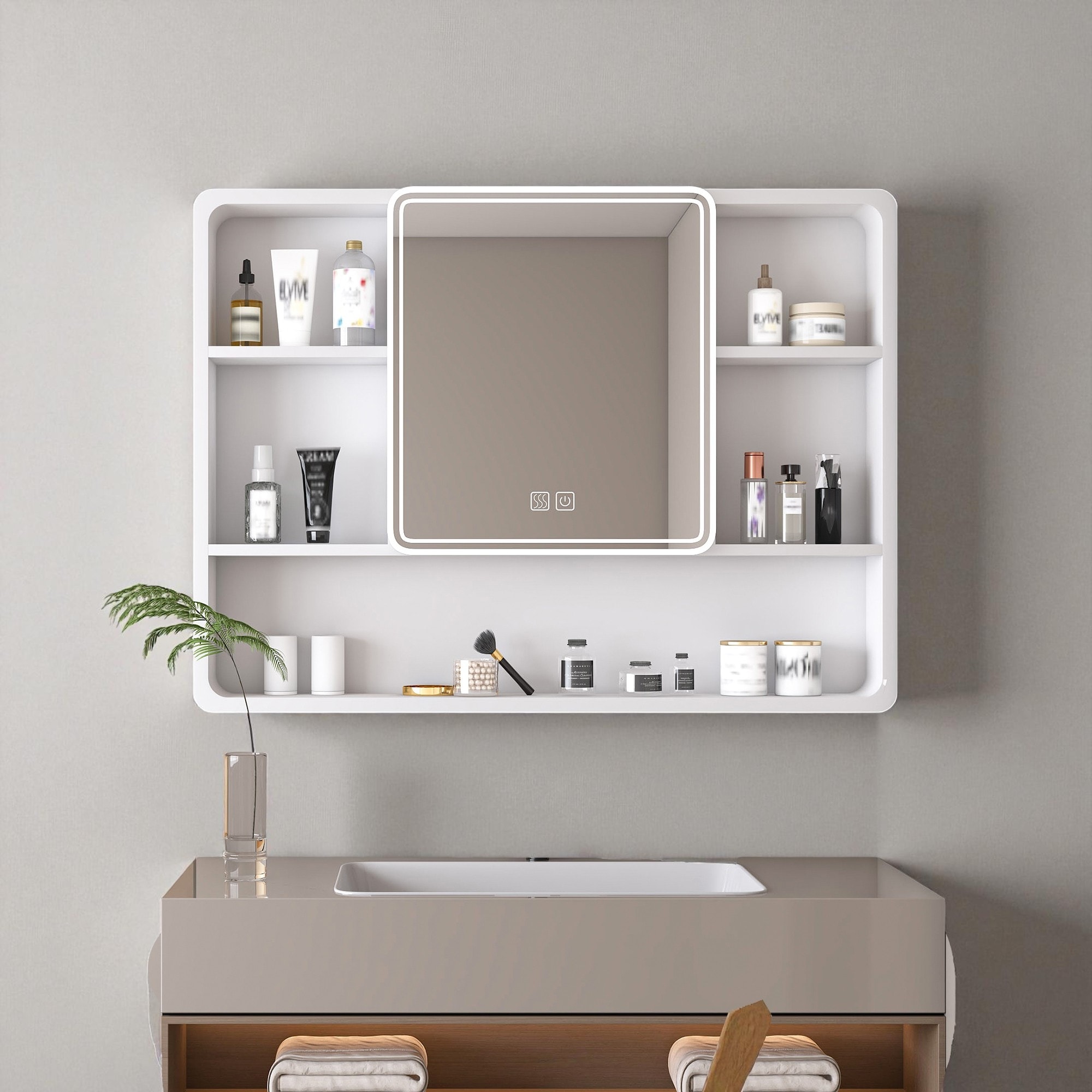 35 Inch Recessed or Surface Mount Medicine Cabinet with LED Light, Defogging, Cosmetic Storage Rack and Hair Dryer Holder