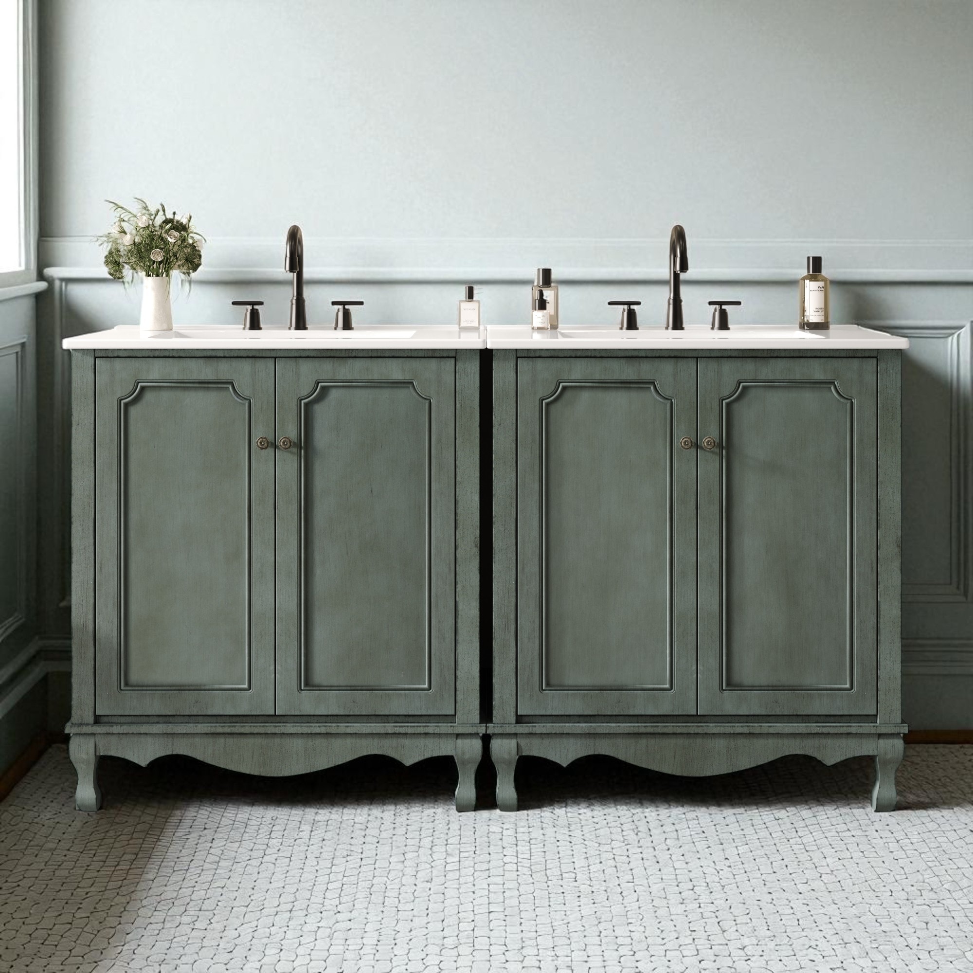 60" Double Sink Bathroom Vanity Set with Ceramic Sinks, Vintage Wood Storage Cabinet with Antique Knobs & Adjustable Shelves