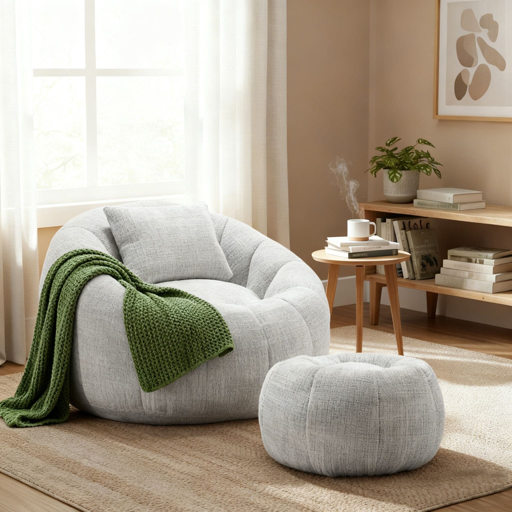 Cloud-Like Memory Foam Bean Bag Chair & Ottoman Set Soft Fabric Lounger with Pillow for Living Room/Playroom