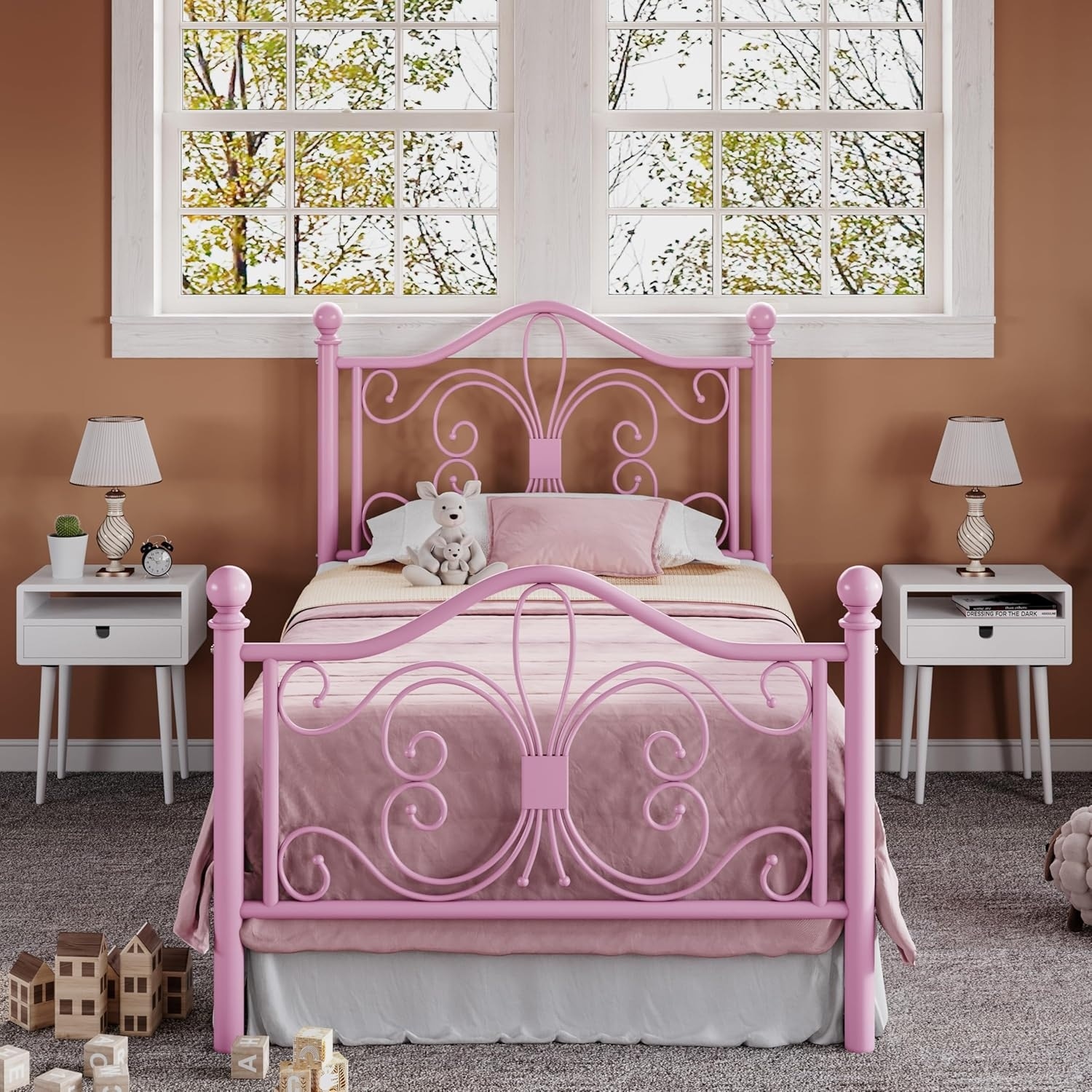 Twin Size Metal Bed Frame with Butterfly Design Headboard, Easy Assembly, Pink