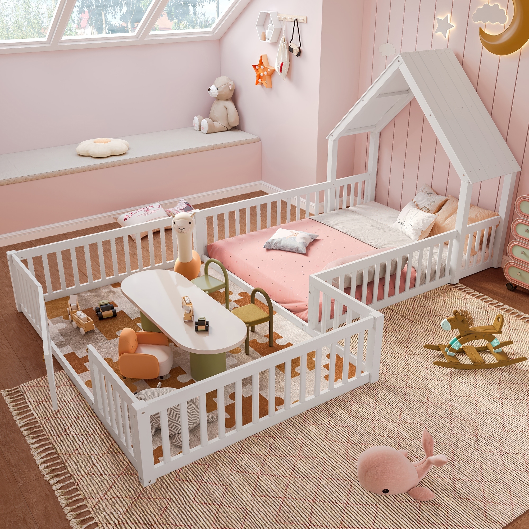 Full Size House Floor Bed, Double Full Floor Bed with Door and Full-length Guardrails, Multi-function Design