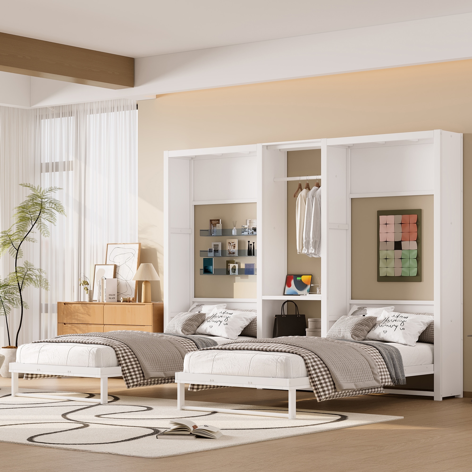 Twin and Twin Murphy Bed with Wardrobe, Shelves and Power Outlets, 2 in 1 Design, Space-saving