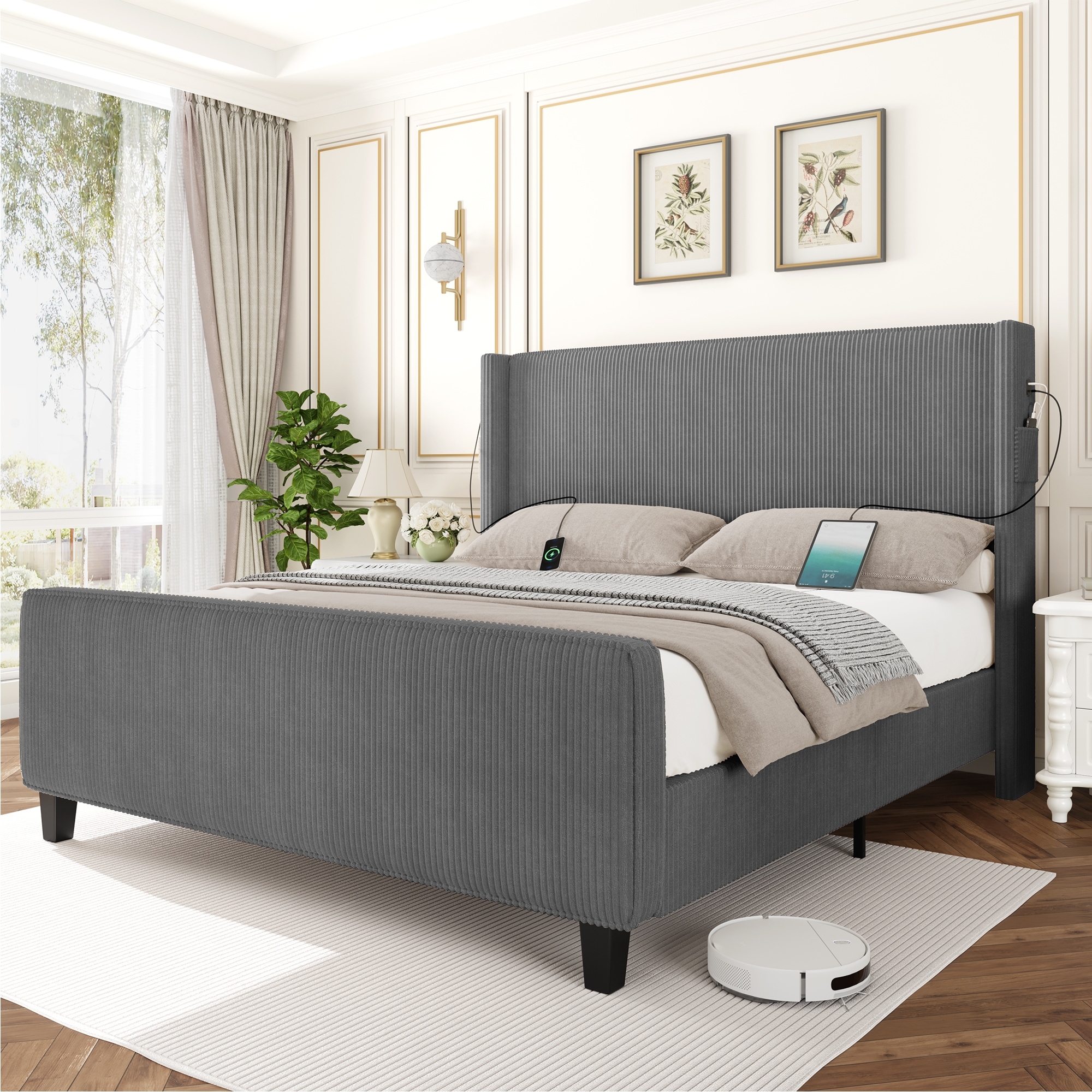 Corduroy Upholstered Bed Frame With Vertical Stripe Wingback And High Footboard