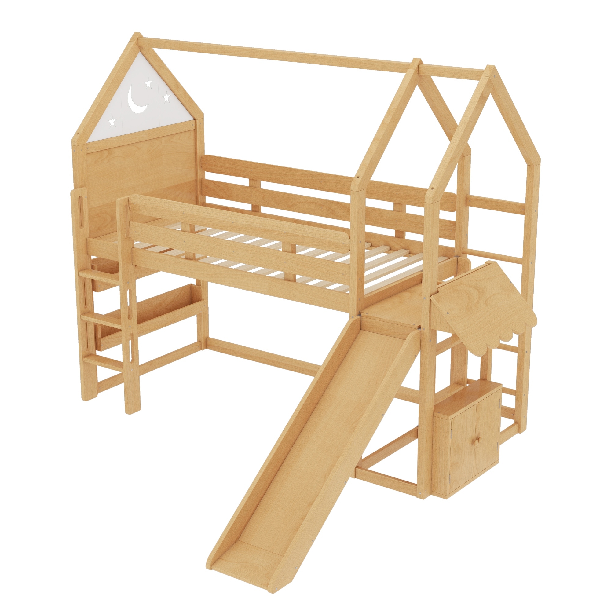 Twin Size Loft Bed with Bookshelf Playful Design for Kids House-Shaped Structure with Slide High-Quality Safety Rails,Beige