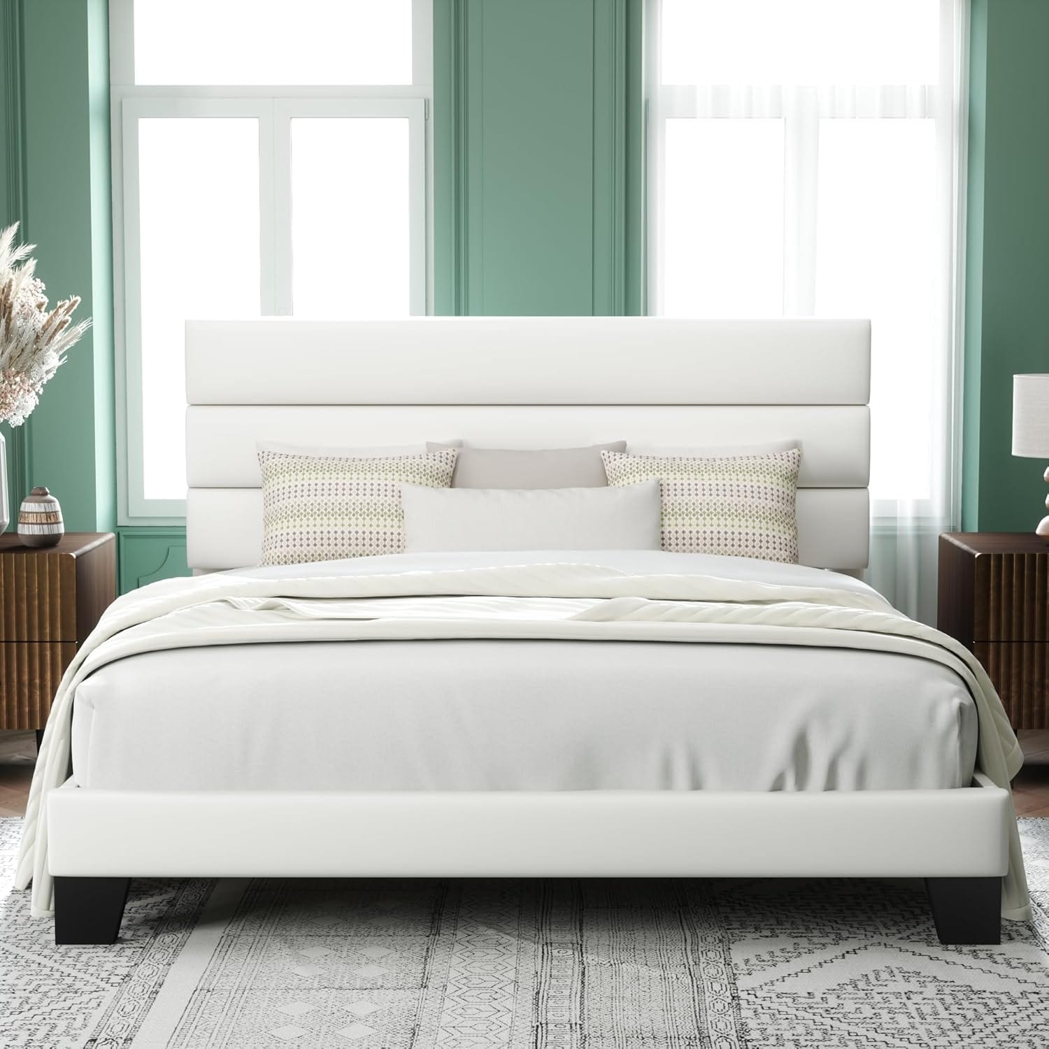 King Size Platform Bed Frame with Velvet Headboard, Wooden Slats, No Box Spring Needed, Easy Assembly, White