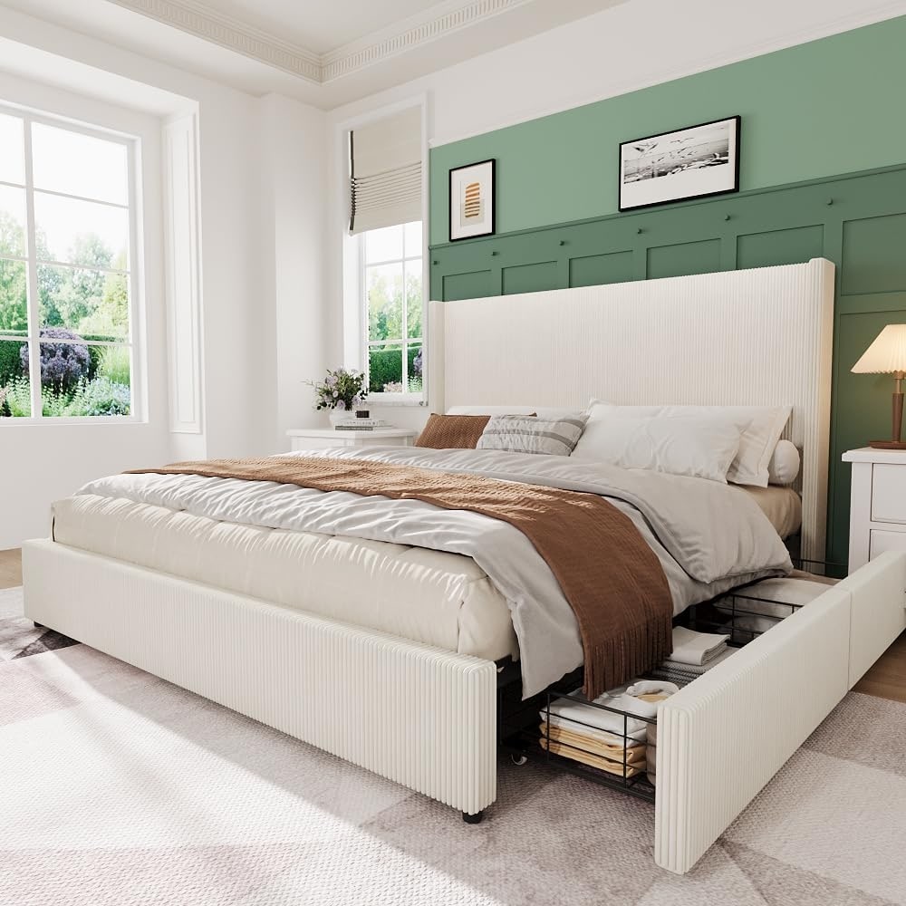King Corduroy Platform Bed, Storage Drawers, Wingback Headboard & Footboard