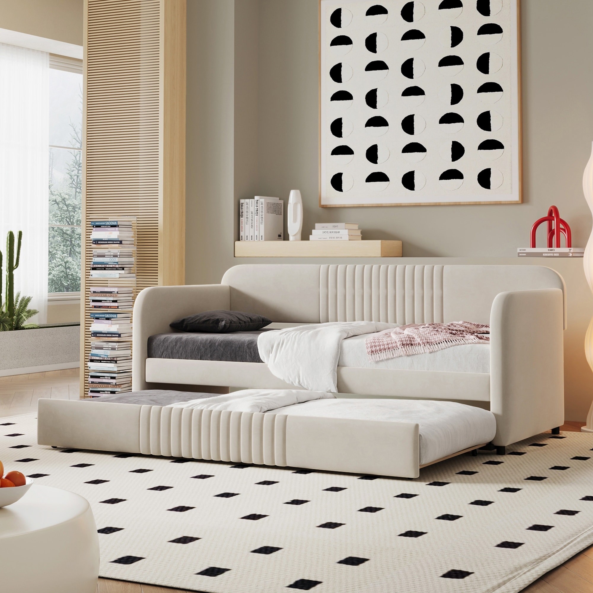 Upholstered Daybed Sofa Bed Twin Size With Trundle Bed and Wood Slat ,Beige