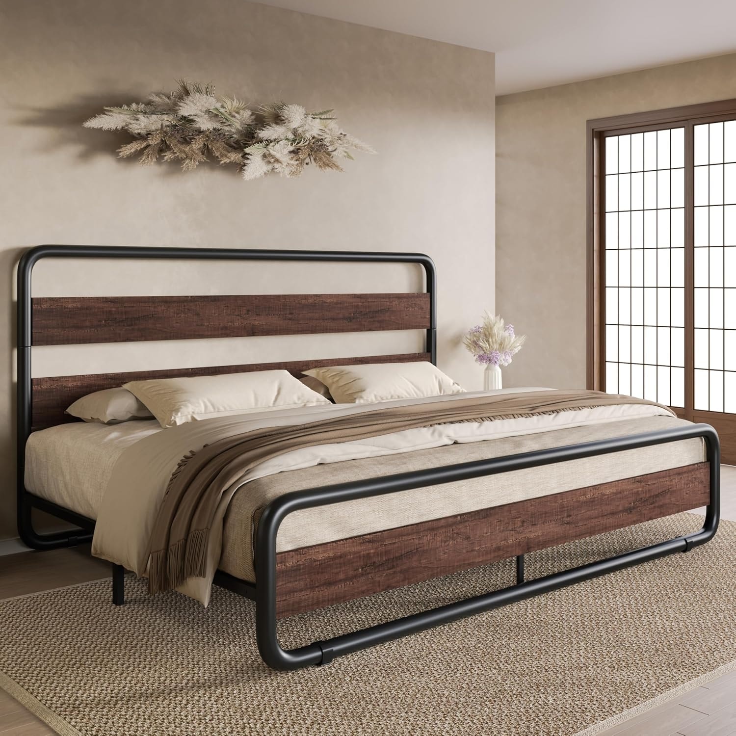 King Size Metal Bed Frame with Wooden Headboard, Under-Bed Storage, Mahogany