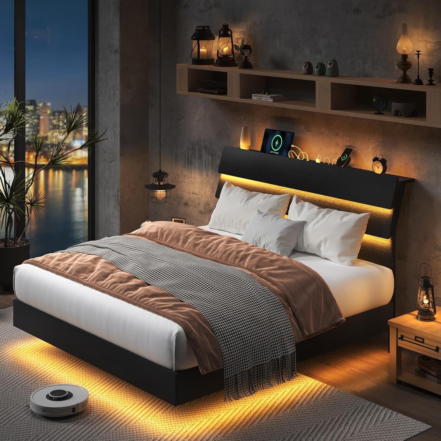 Full Size Floating Bed Frame with LED Lights, Storage Headboard, Charging Station, and Heavy Duty Metal Slats