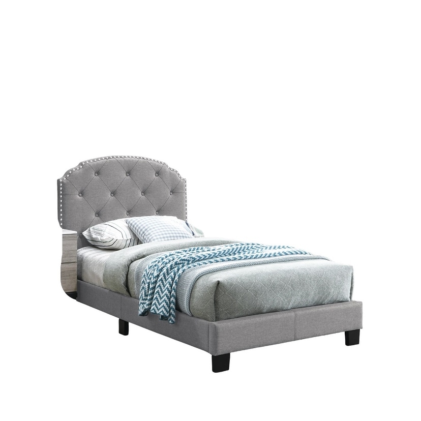 Twin Size Bed Nailhead Trim Button Tufted Burlap Fabric Light Gray Finish
