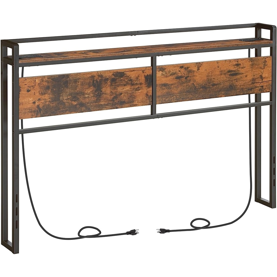 Queen Size Headboard with USB Ports, Outlets, Adjustable Height, and Storage Shelf, Rustic Brown and Black