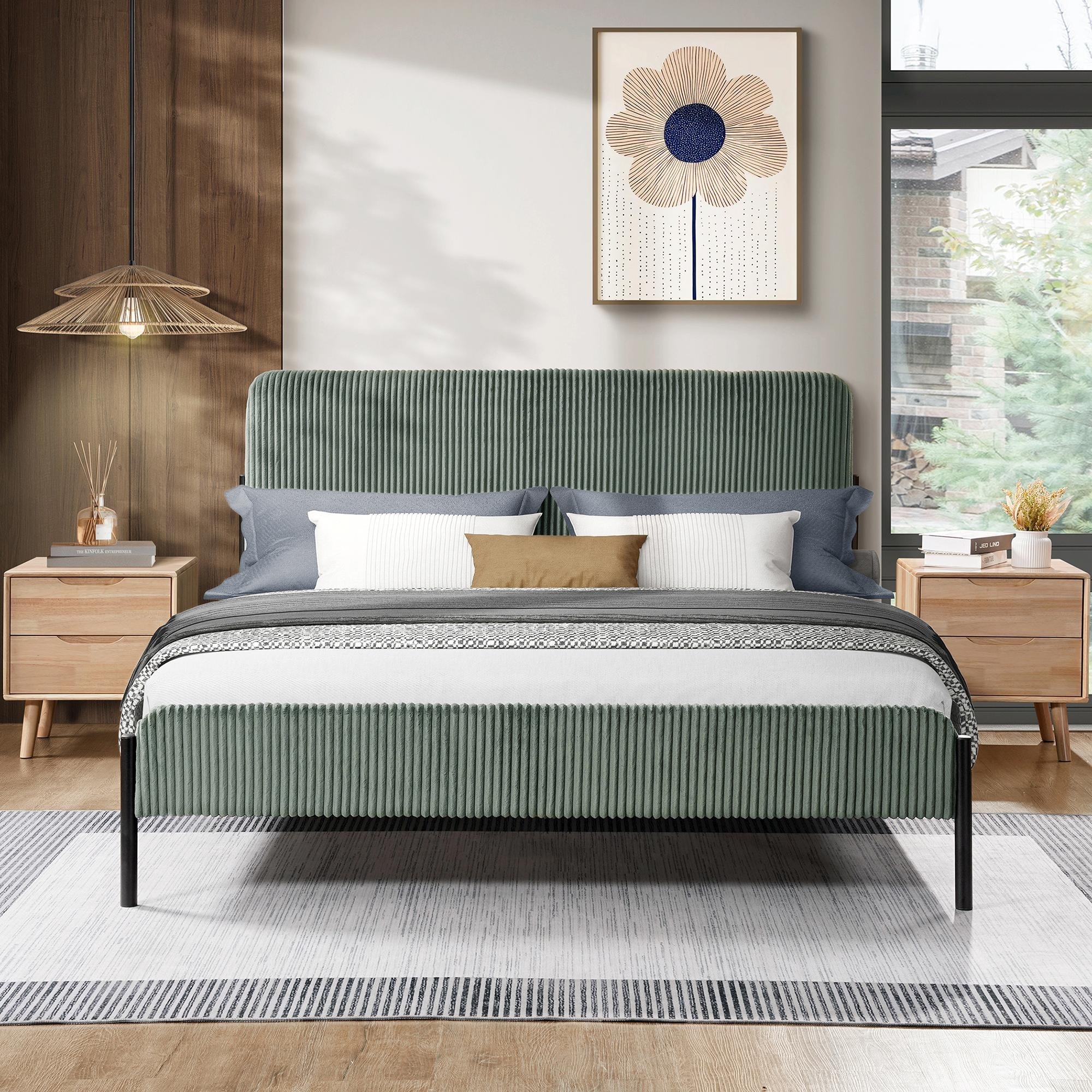 Queen Upholstered Bed with Corduroy Fabric & Metal Legs