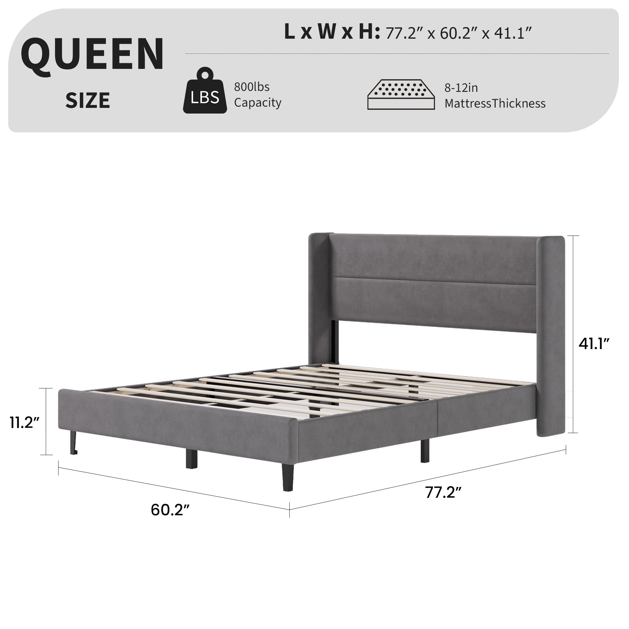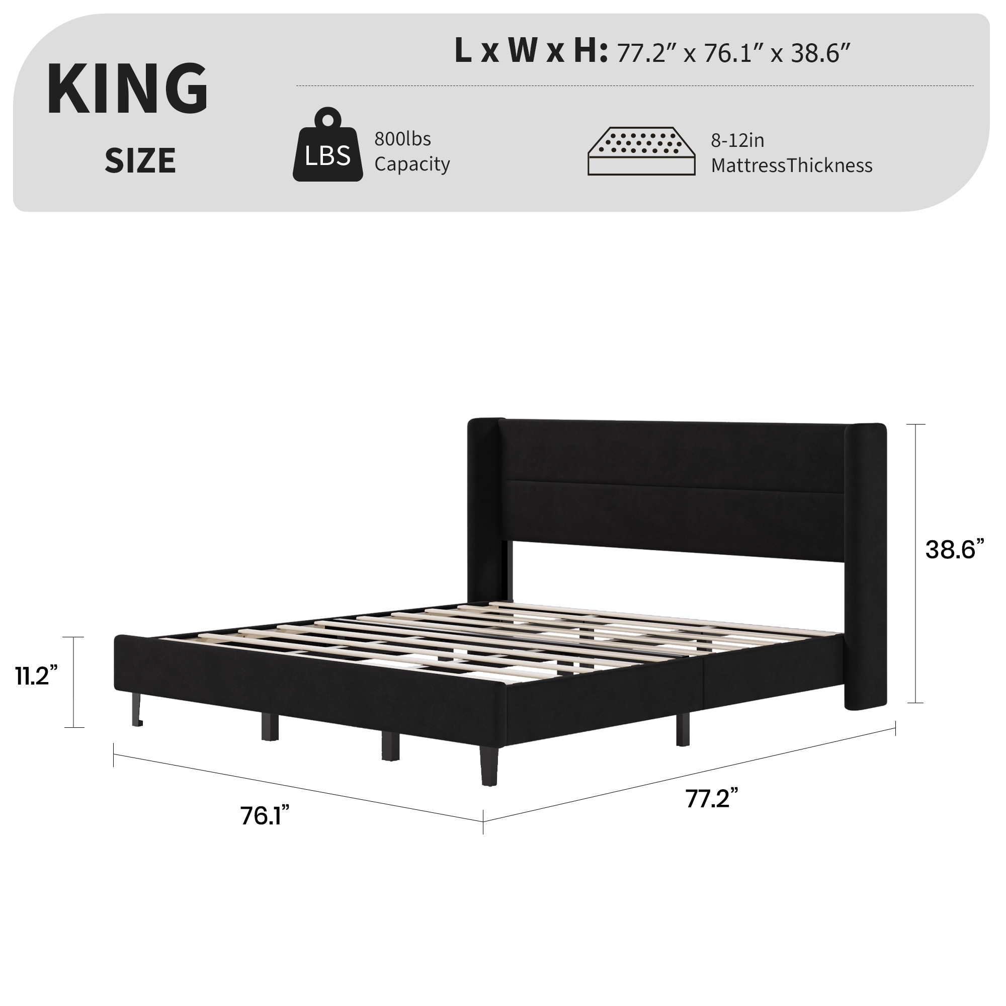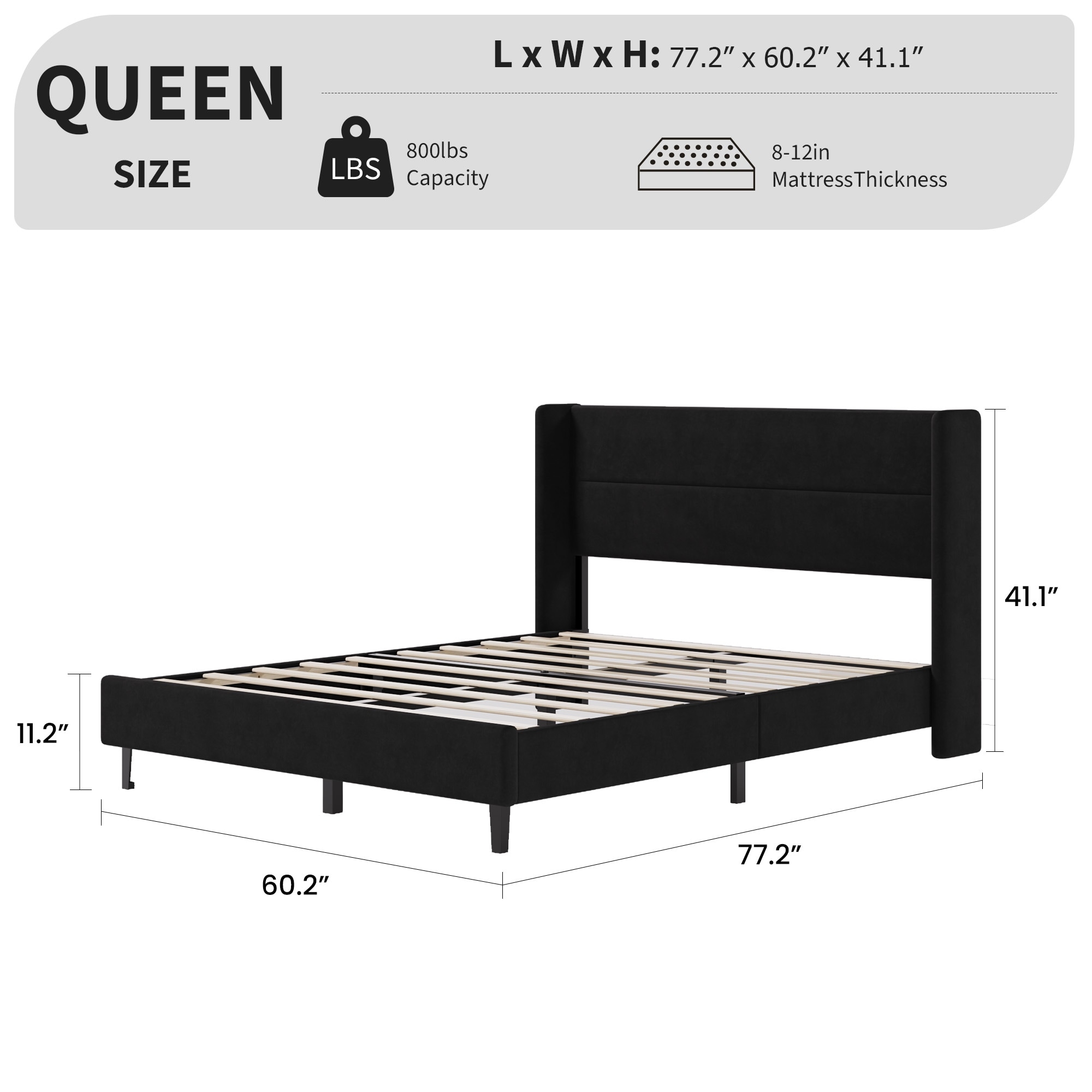 Queen Size Bed Frame with Wingback Headboard, Velvet Upholstered Platform Bedframe with Wood Slats
