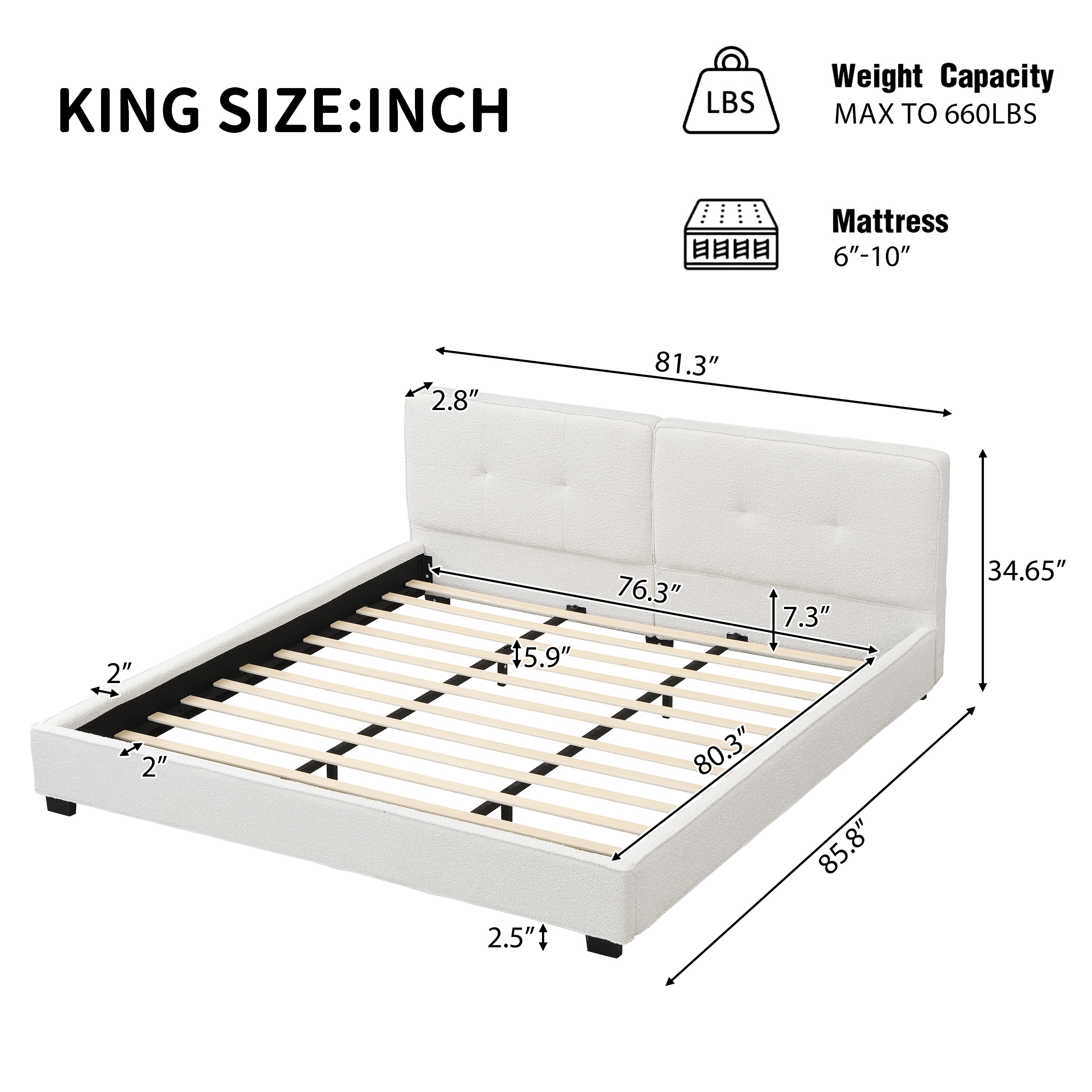 Roomfitters King Size Upholstered Platform Bed Frame with Boucle Fabric Headboard and Solid Wood Legs, White