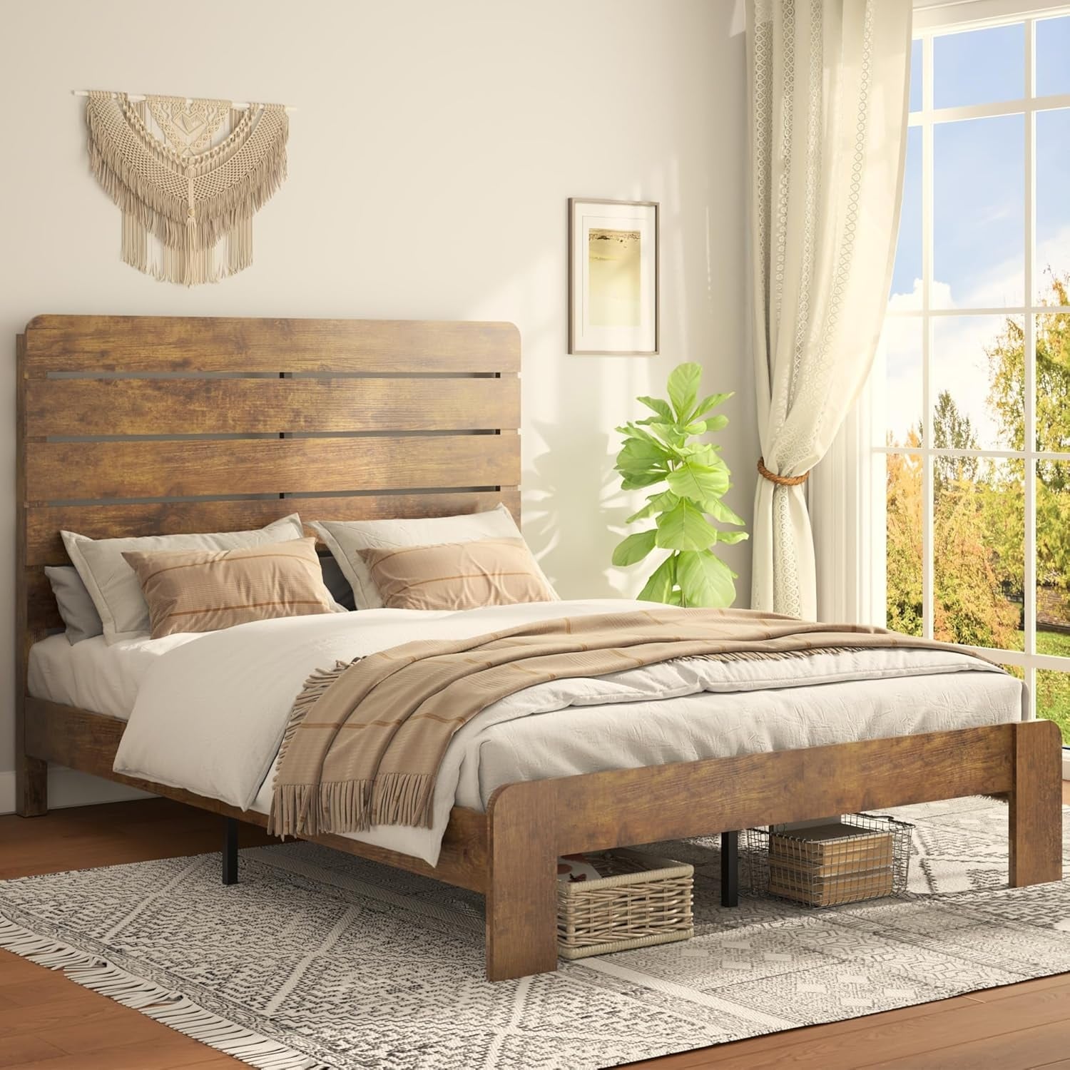 Rustic Queen Bed Frame with Storage, Wooden Headboard, No Box Spring Needed, Sturdy & Noise-Free, Easy Assembly, Light Brown