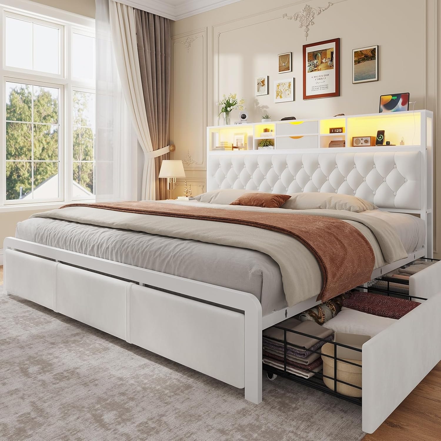 King Size Bed Frame with Storage Drawers, LED Lights, Charging Station, Upholstered Headboard, Easy Assembly, Beige