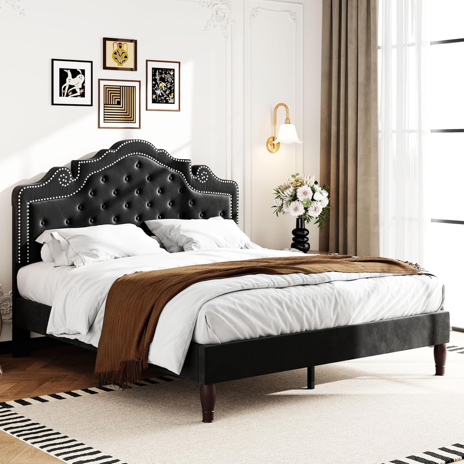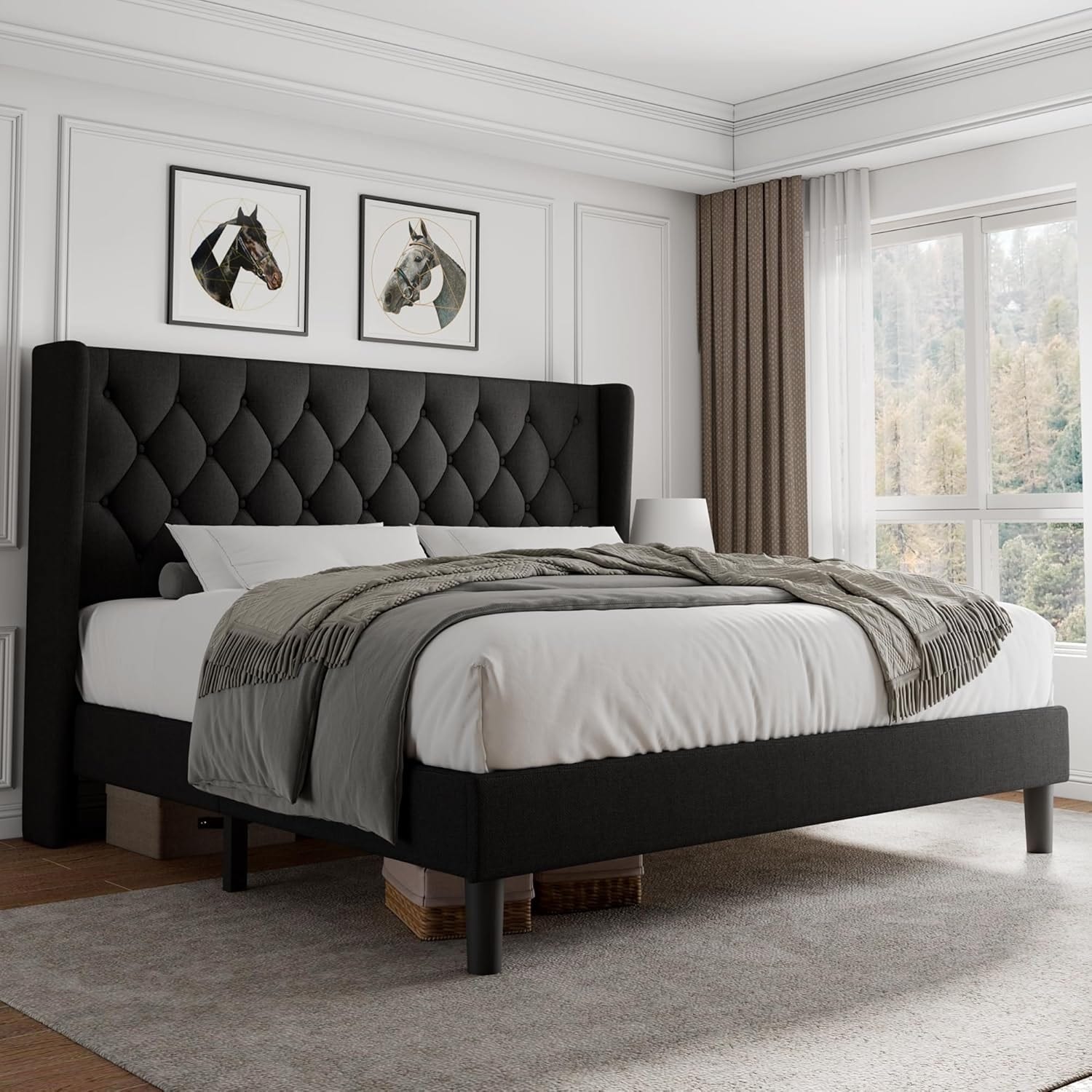 King Size Platform Bed Frame with Tufted Headboard, Solid Wooden Slats, 8 Inch Underbed Space, Noise Free, Easy Assembly, Black