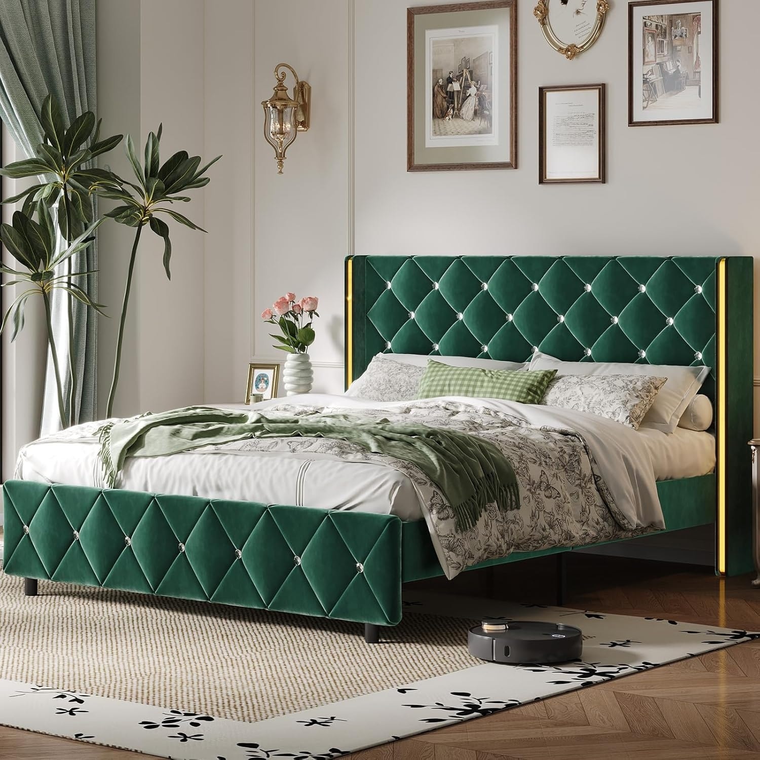 Queen Size Velvet Upholstered Bed Frame with Wingback Headboard, Wood Slat Support, Easy Assembly, Green