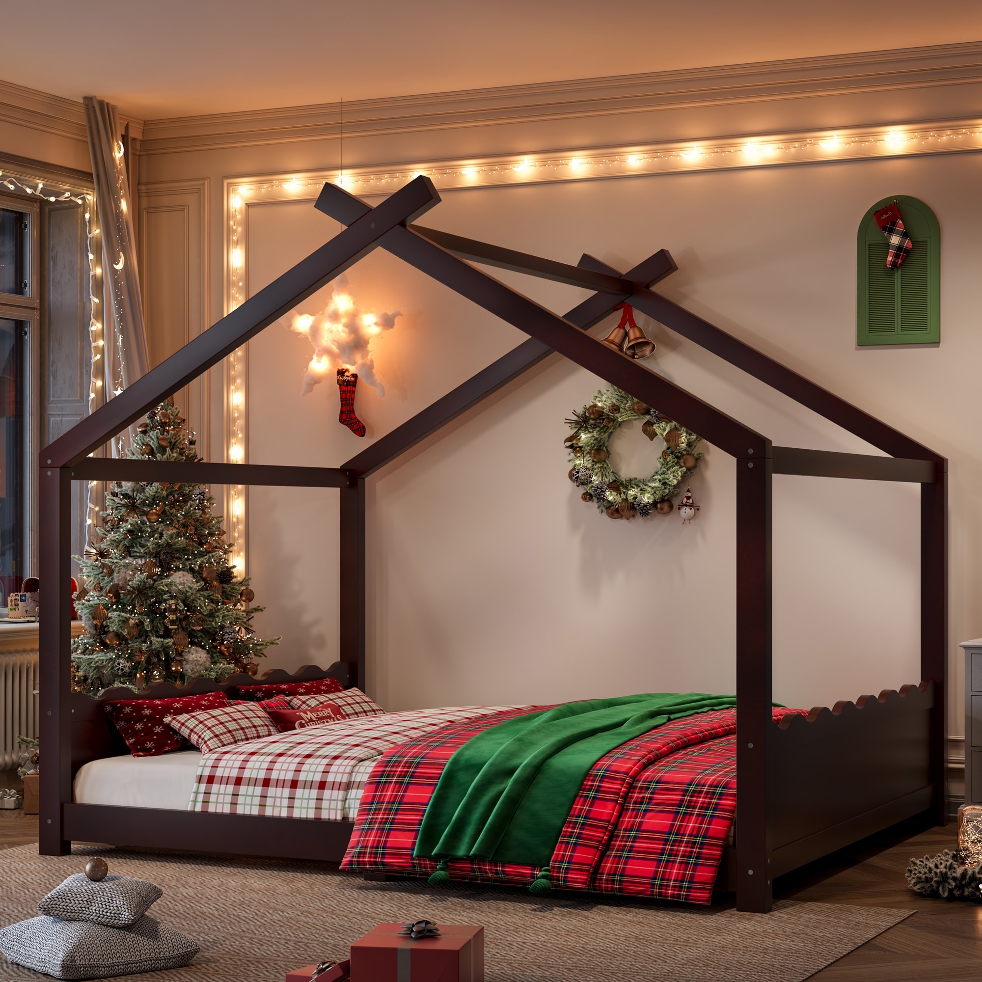 Queen House Floor Bed with Support Slats, Solid Wood House Bed Frame for Kids, No Box Spring Needed