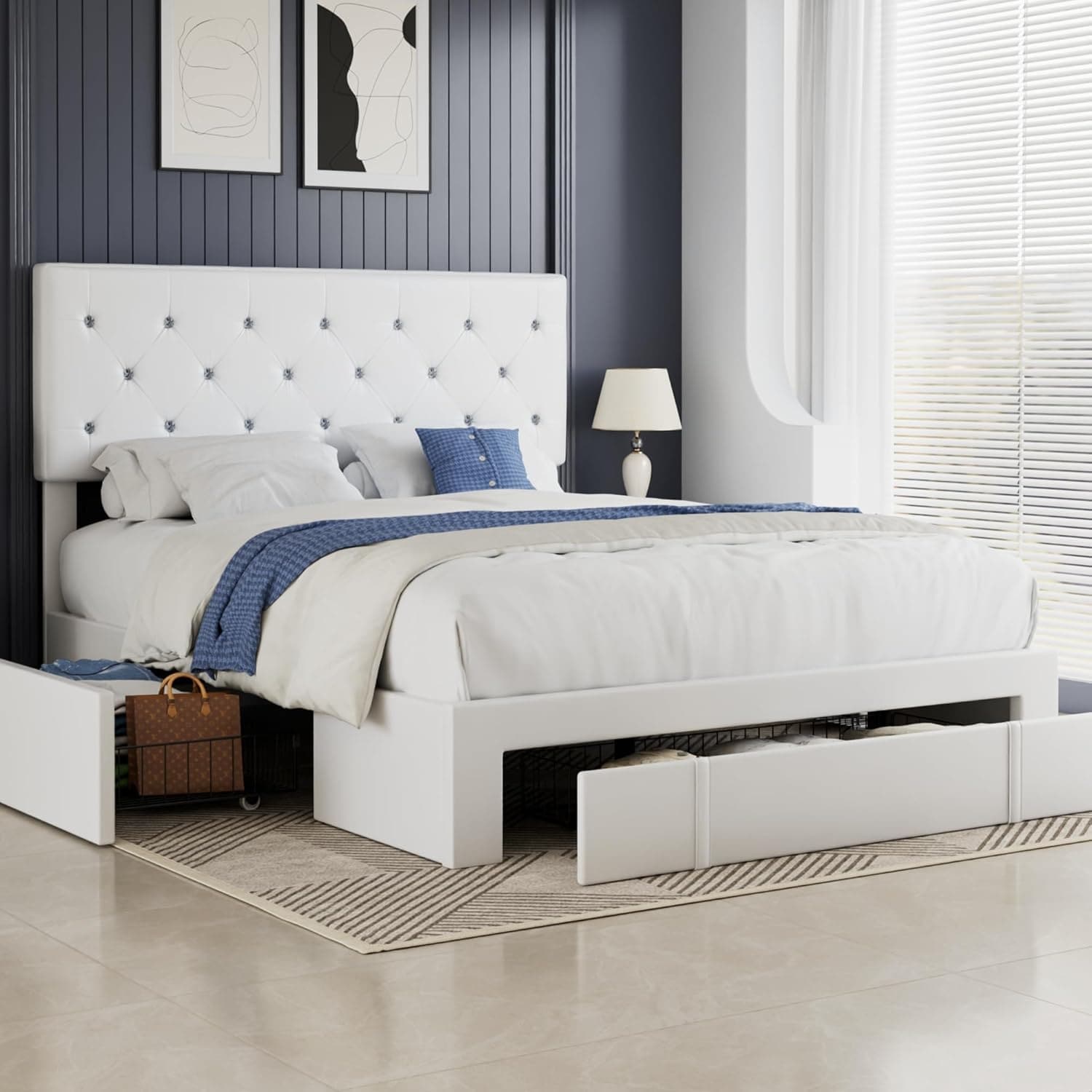 Queen Size Bed Frame with Storage Drawers, Leather Upholstered, Adjustable Headboard, Solid Wood Slat Support