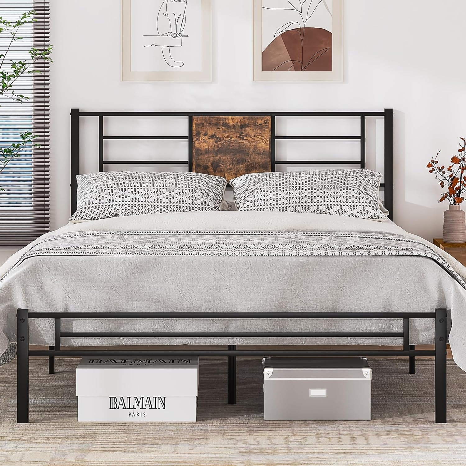 Queen Size Bed Frame with Headboard, Heavy-Duty Metal and Wood Platform, Easy Assembly, Black