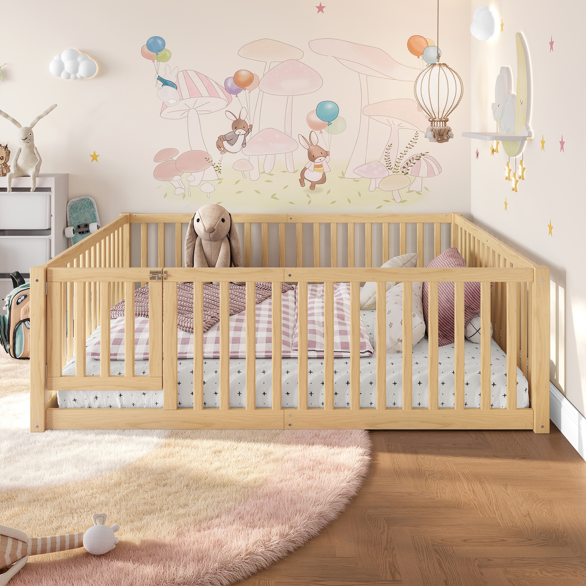 Full Size Bed Floor Bed with Safety Guardrails and Door for Kids