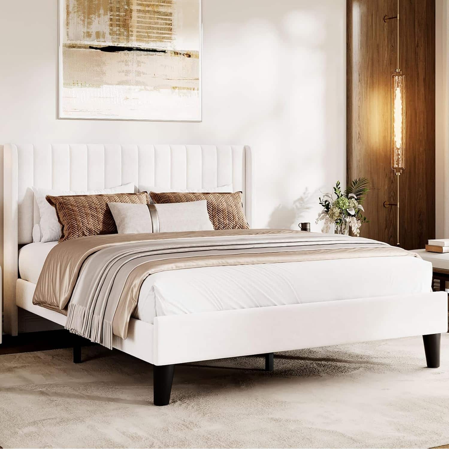 Full/ Queen Size Velvet Upholstered Platform Bed Frame with Vertical Channel Tufted Wingback Headboard
