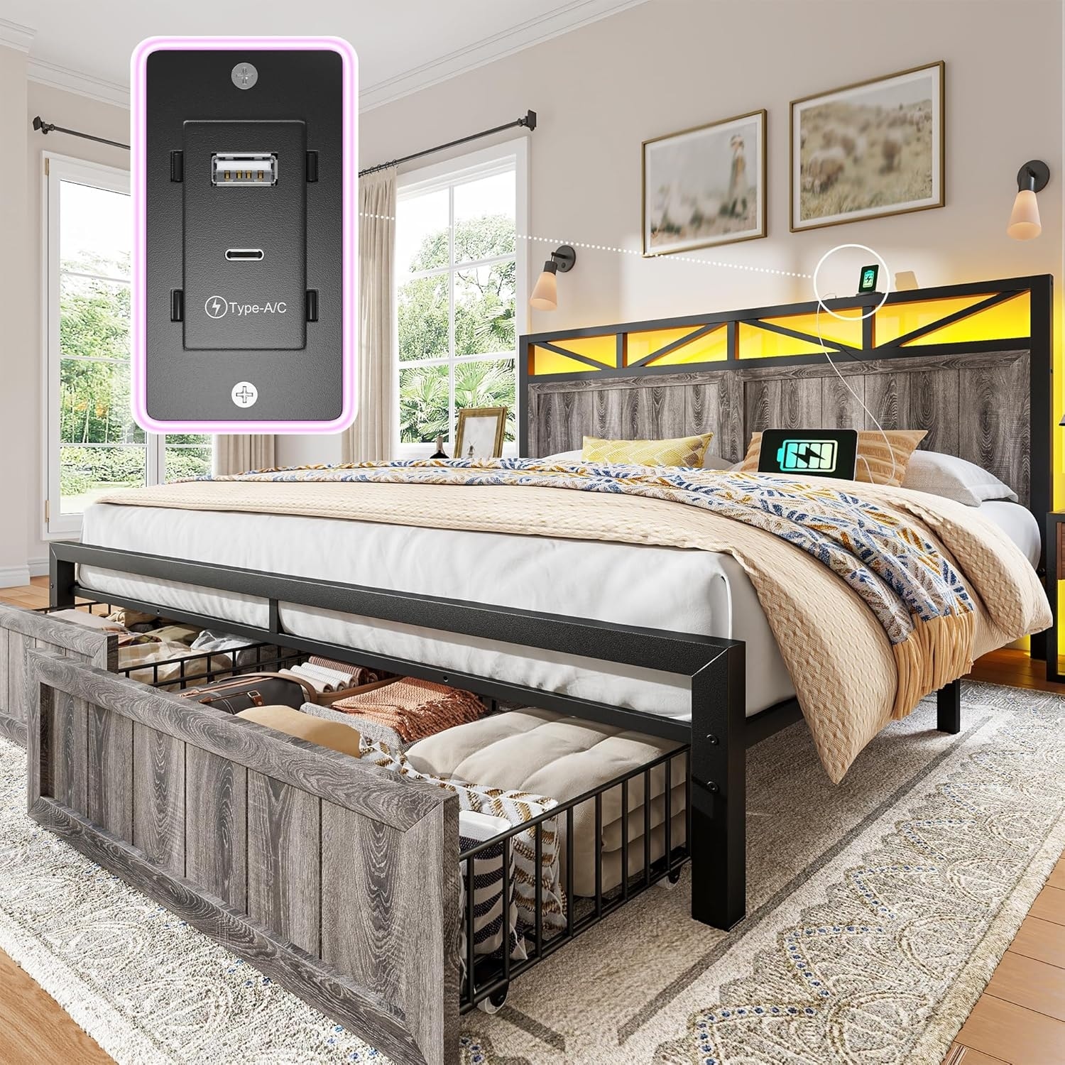 King Size Bed Frame with Storage Drawers, Wooden Headboard, LED Lights, Charging Station, No Noise, No Box Spring Needed, Grey