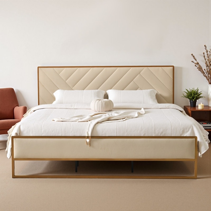 King Size Upholstered Bed Frame with Thick Fabric, Grounded Platform Bed with Headboard and Solid Frame, No Box Spring Needed