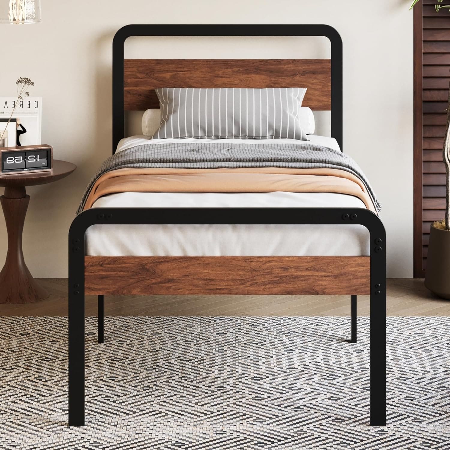 18 Inch Twin Bed Frame with Wood Headboard, Heavy Duty Metal Slats, Under Bed Storage, No Noise, Easy Assembly, Black
