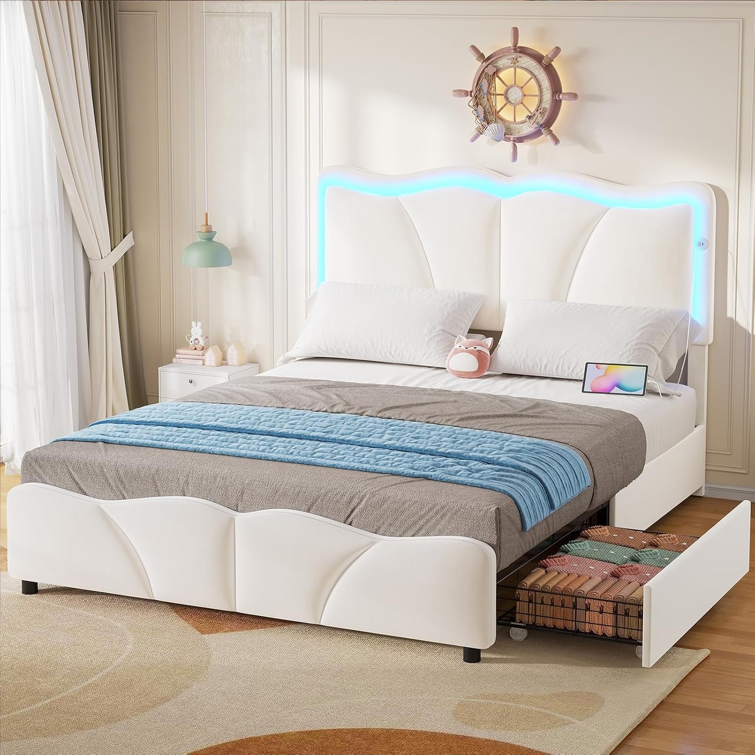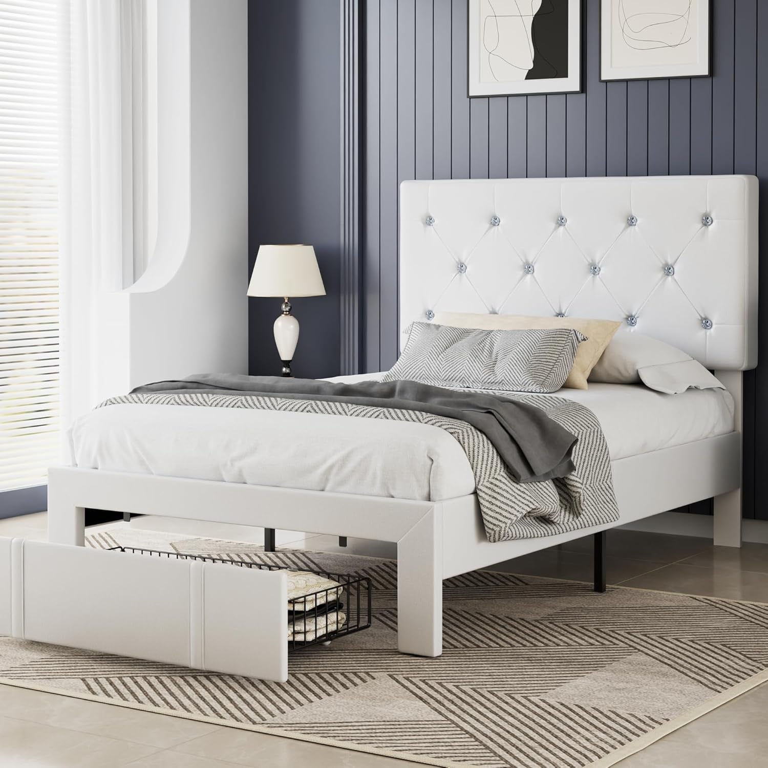 Roomfitters Queen Size Upholstered Platform Bed with Storage Drawer and Velvet Wingback Headboard