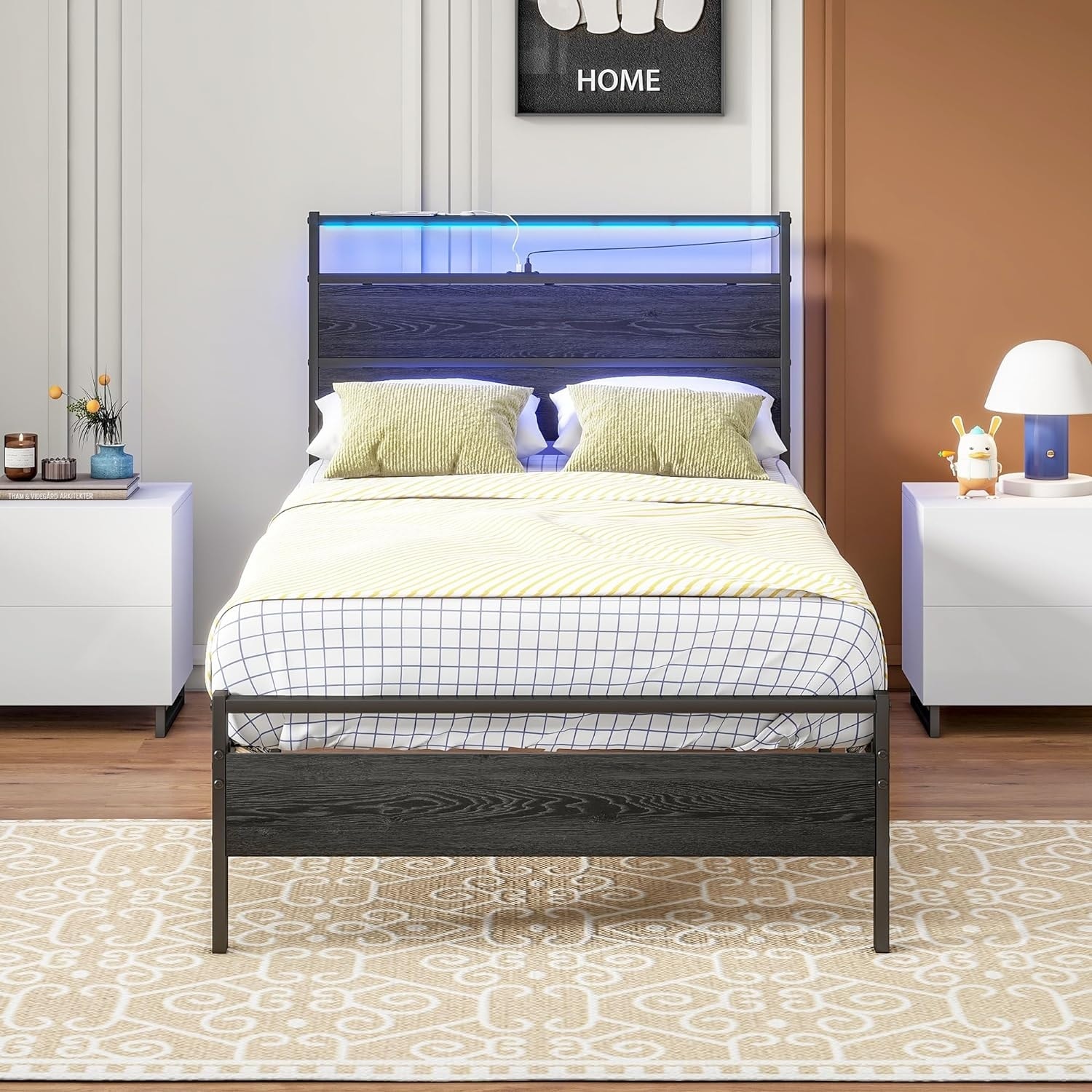 Twin Bed Frame with LED Lights, Charging Station, and Heavy Duty Metal Slats, No Box Spring Needed, Black