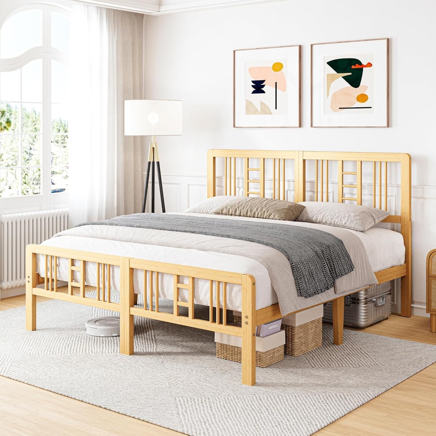 King Size Bamboo Wood Bed Frame with Headboard, Metal Slat Support, No Box Spring Needed, Easy Assembly, Noise Free, Reinforced