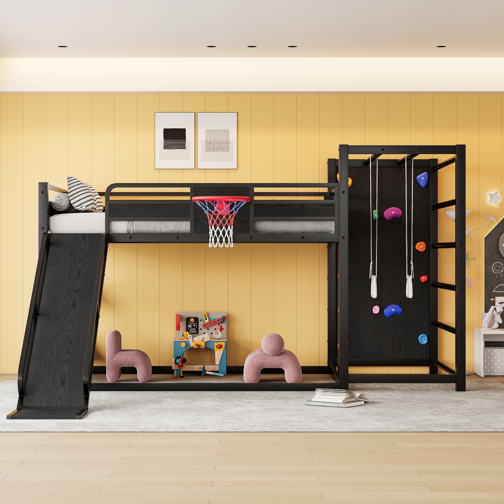 Full size metal loft bed with basketball hoop, pull-up rings, climbing wall, and built-in bookshelves