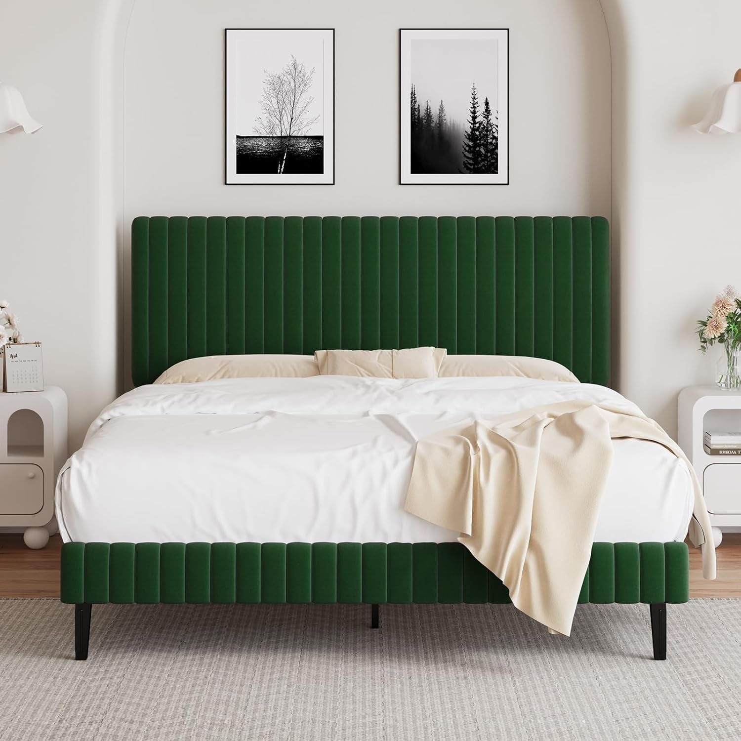 Full Size Velvet Upholstered Platform Bed with Tufted Headboard and Footboard, Easy Assembly, Green
