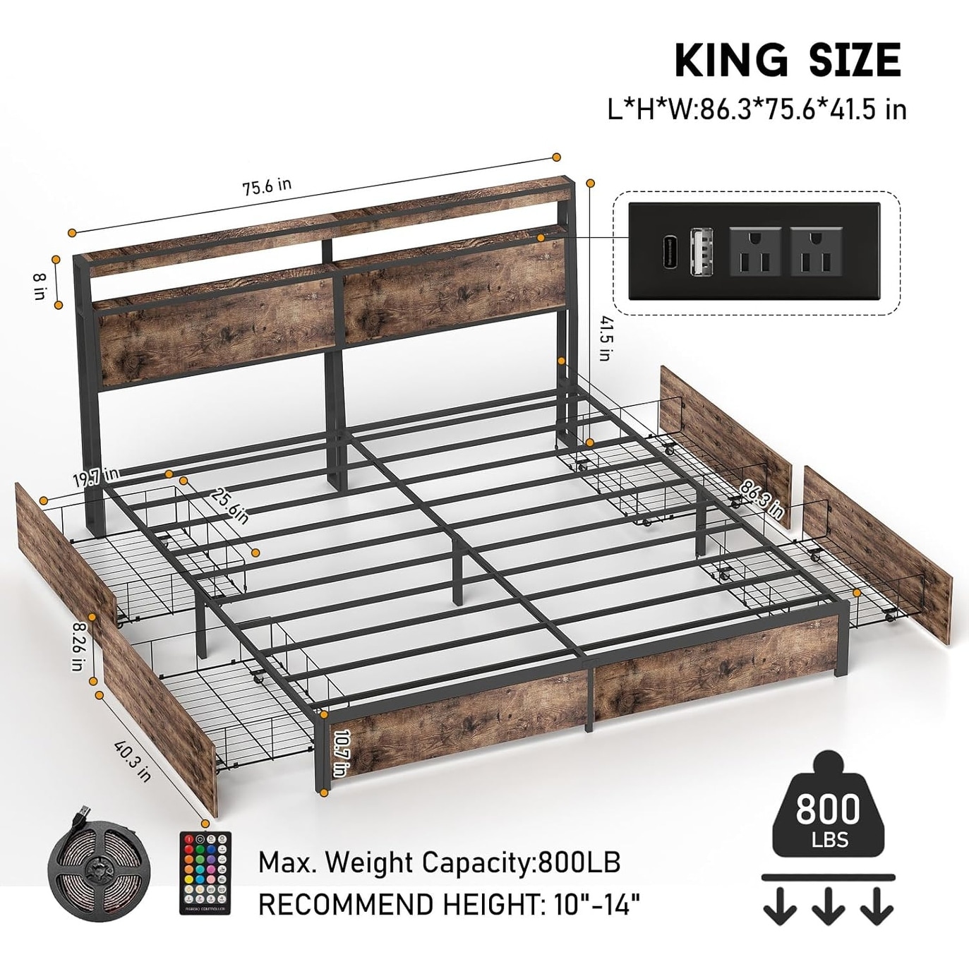 King Size Bed Frame with Storage Drawers, Charging Station, LED Lights, and Solid Wood Headboard