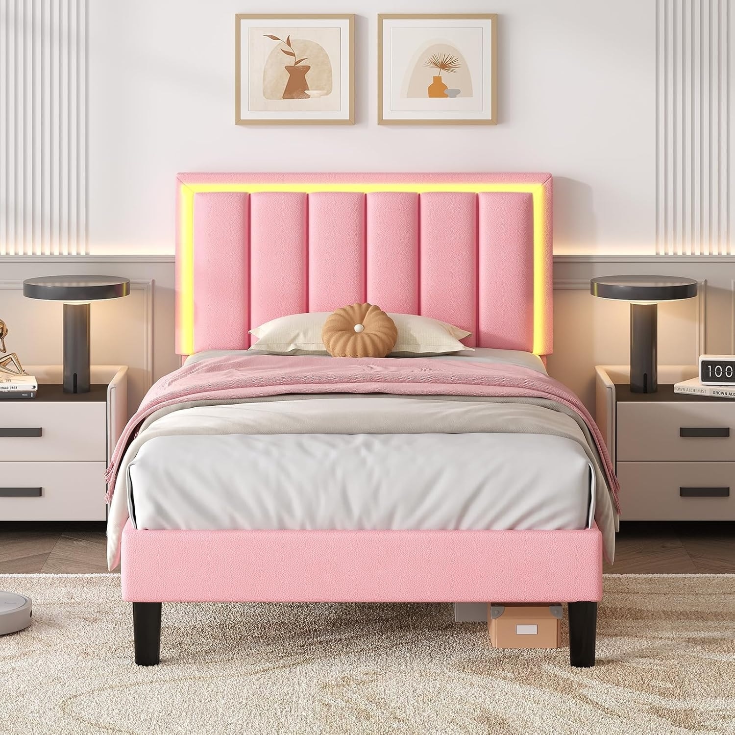 Pink Twin Bed Frame with LED Lights, Upholstered Headboard, Faux Leather, Easy Assembly, No Box Spring Needed