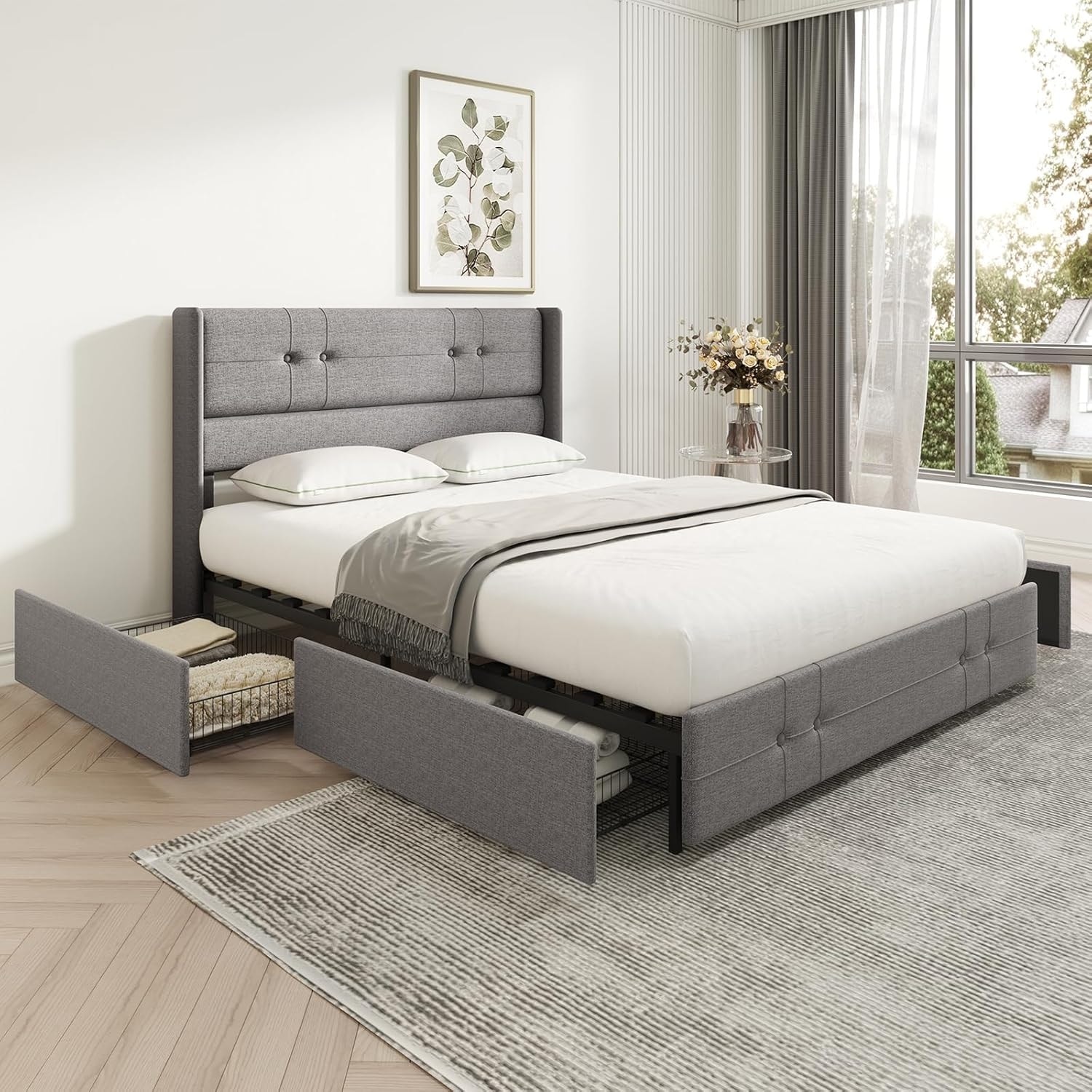 Upholstered Queen Bed Frame with 4 Storage Drawers, Fabric Headboard, Wooden Slats - No Box Spring Needed, Grey Linen