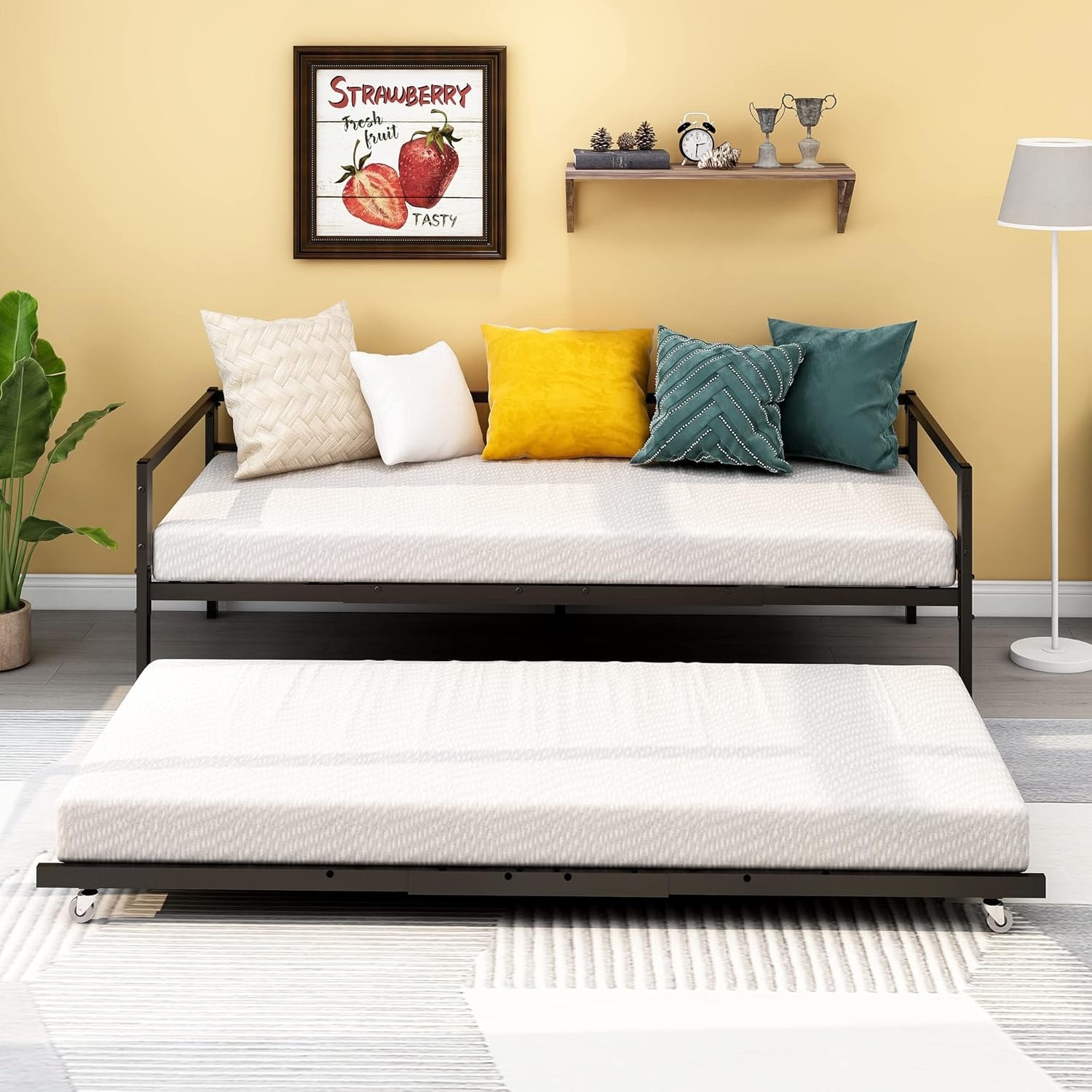 Metal Twin Size Daybed with Trundle, Heavy Duty Slats, Sofa Bed, Twin Platform Mattress Foundation, Black