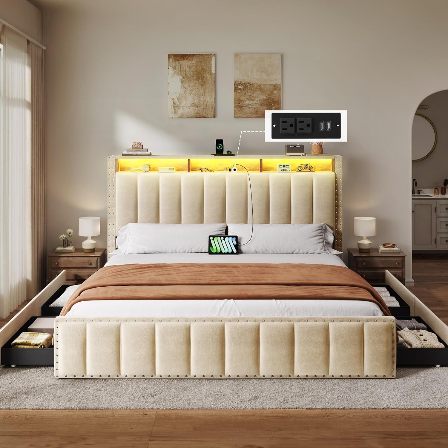 Full Size Bed Frame with Storage Drawers, RGB LED Lights, Charging Station, and Noise-Free Design